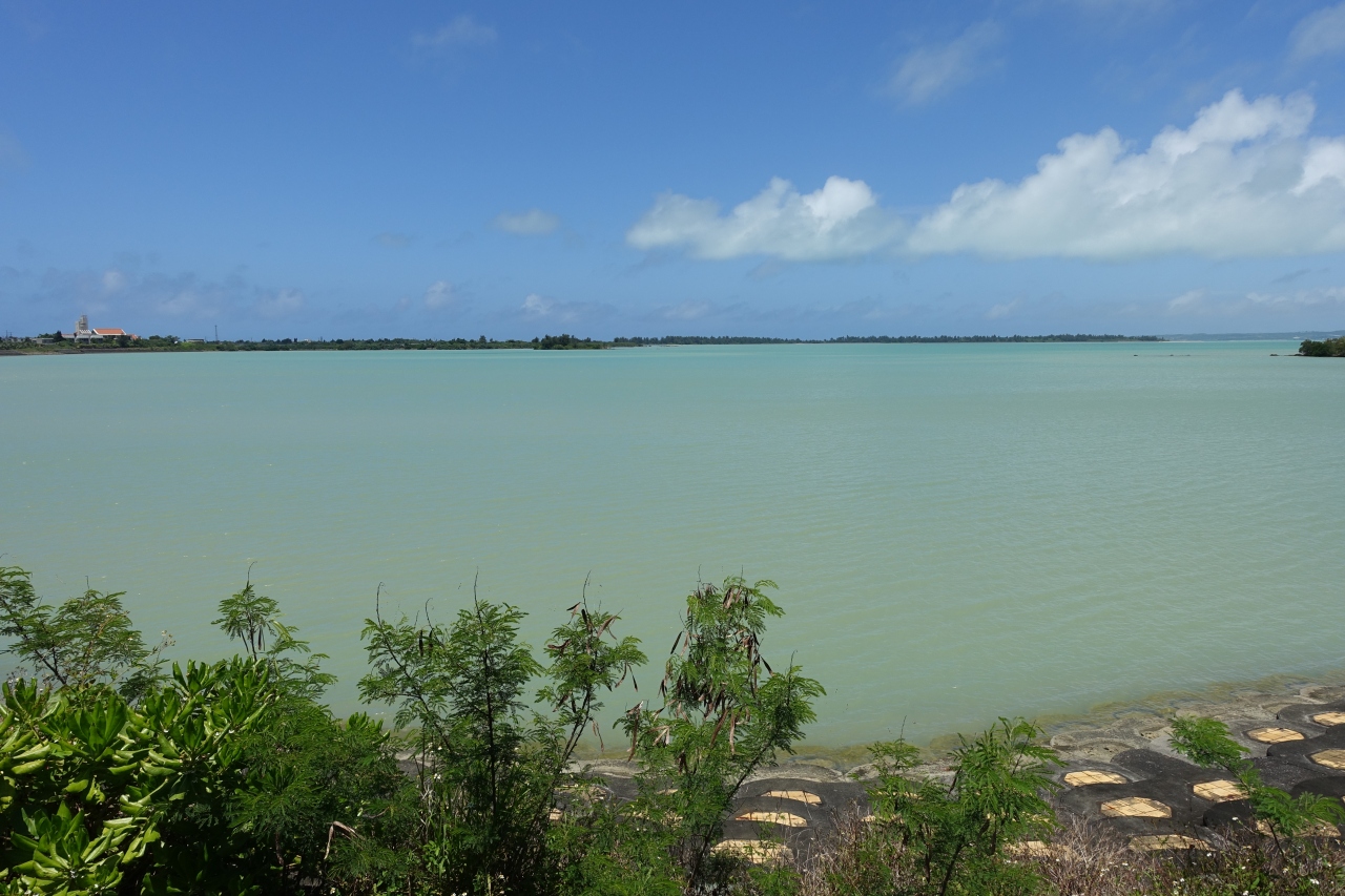 市街地や空港から与那覇前浜方面に行くのに車を走らせていると右側に湾が見えてきます。赤名宮に立ち寄った際にすぐ脇の与那覇湾を眺めたらちょうど満潮のタイミング。岸のギリギリまで海水でたっぷり満たされていて、エメラルドグリーンの美しい湾の風景が広がっていました。