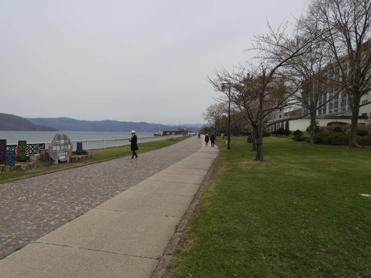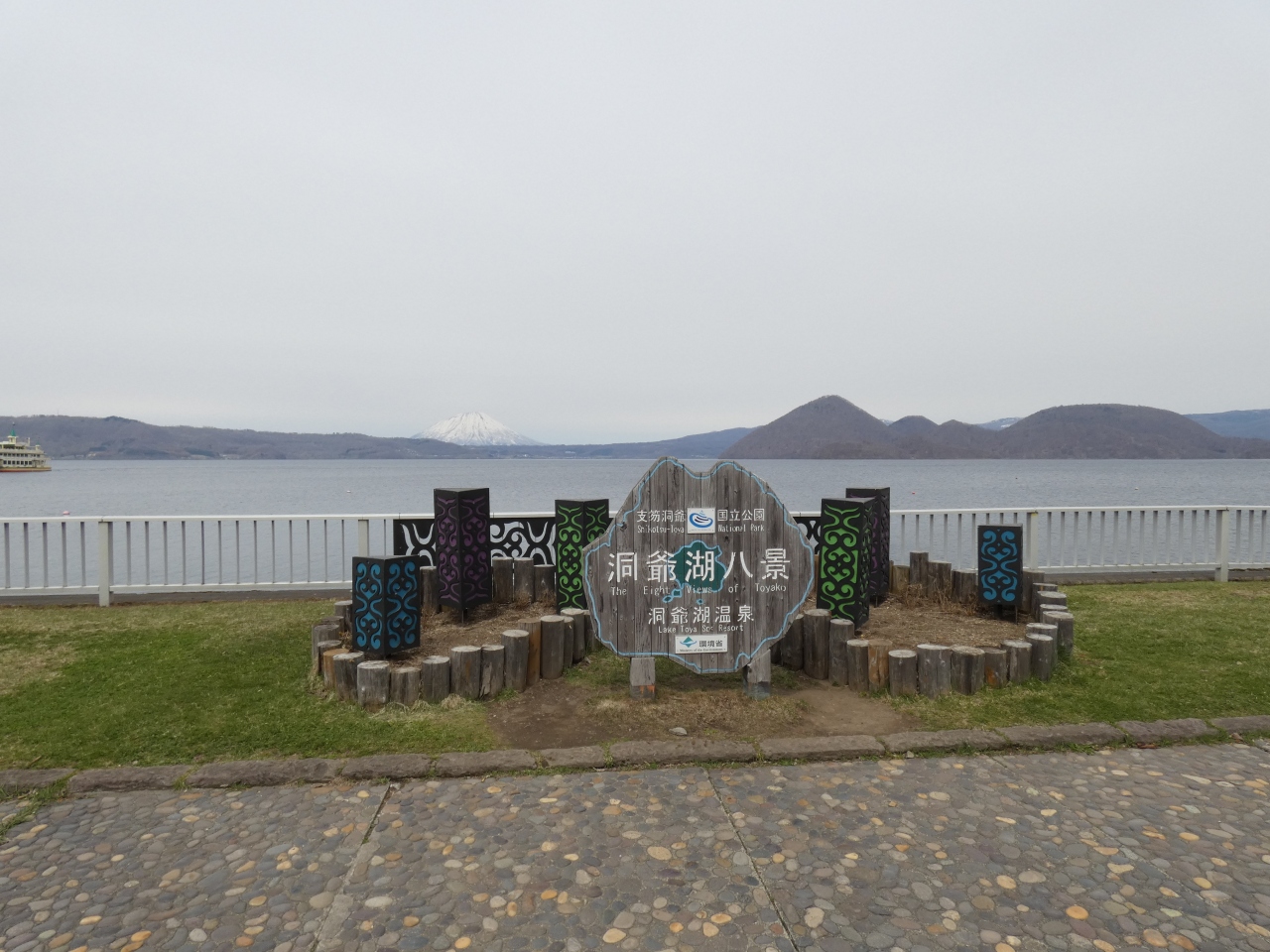 国立公園の洞爺湖の南畔の湖岸に広がる公園。洞爺湖や奥に聳える蝦夷富士・羊蹄山が一望できる絶景の場所にあります。洞爺湖の中央に浮かぶ4つの島からなる中島も見えます、目の前の湖岸からは遊覧船が発着し、ボート乗り場もあります。公園内には洞爺湖温泉の足湯が幾つもあり温泉気分を楽しめます。此処からの眺めは洞爺湖八景と言われるようです。