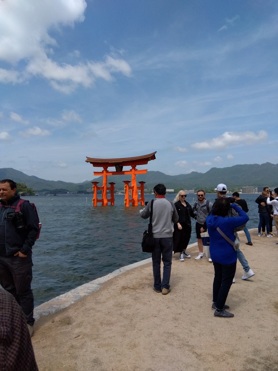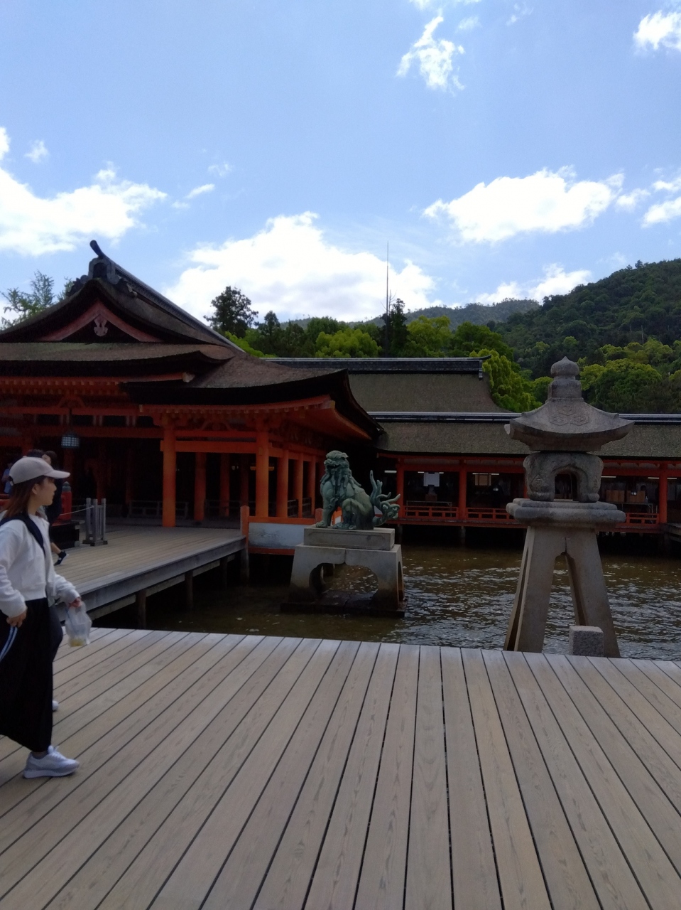 午前中の10時前に訪れました。まだ途中のお店は空いていませんでしたが、神社にはすでに多くの人が訪れていました。外国からの観光客の方が多くみられました。昨年末に改修が終わった大鳥居も海の中で輝いて見えました。