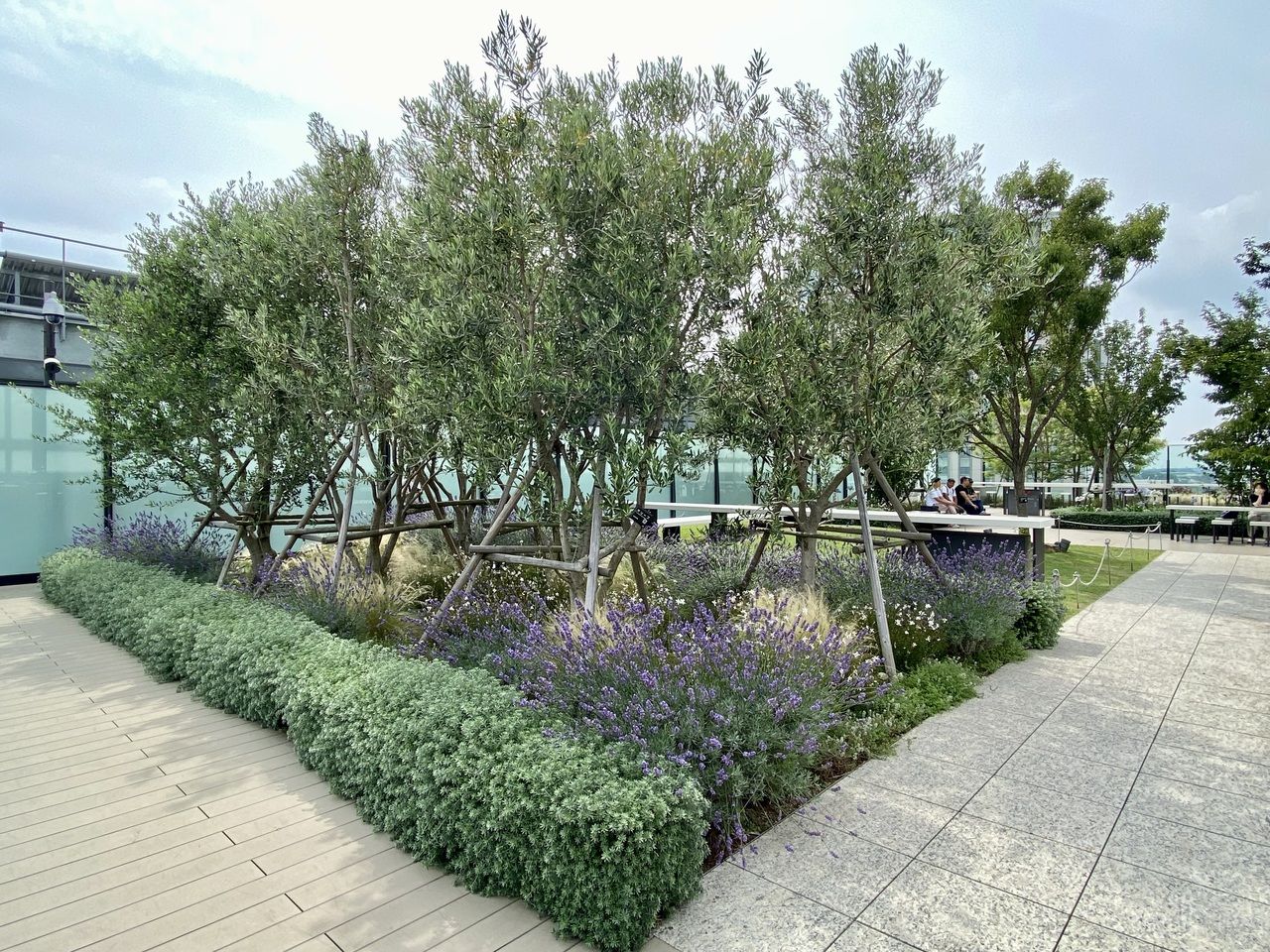 12階、無料で利用できるテーブルやベンチもあり、花が咲き木々や芝生の緑が多い