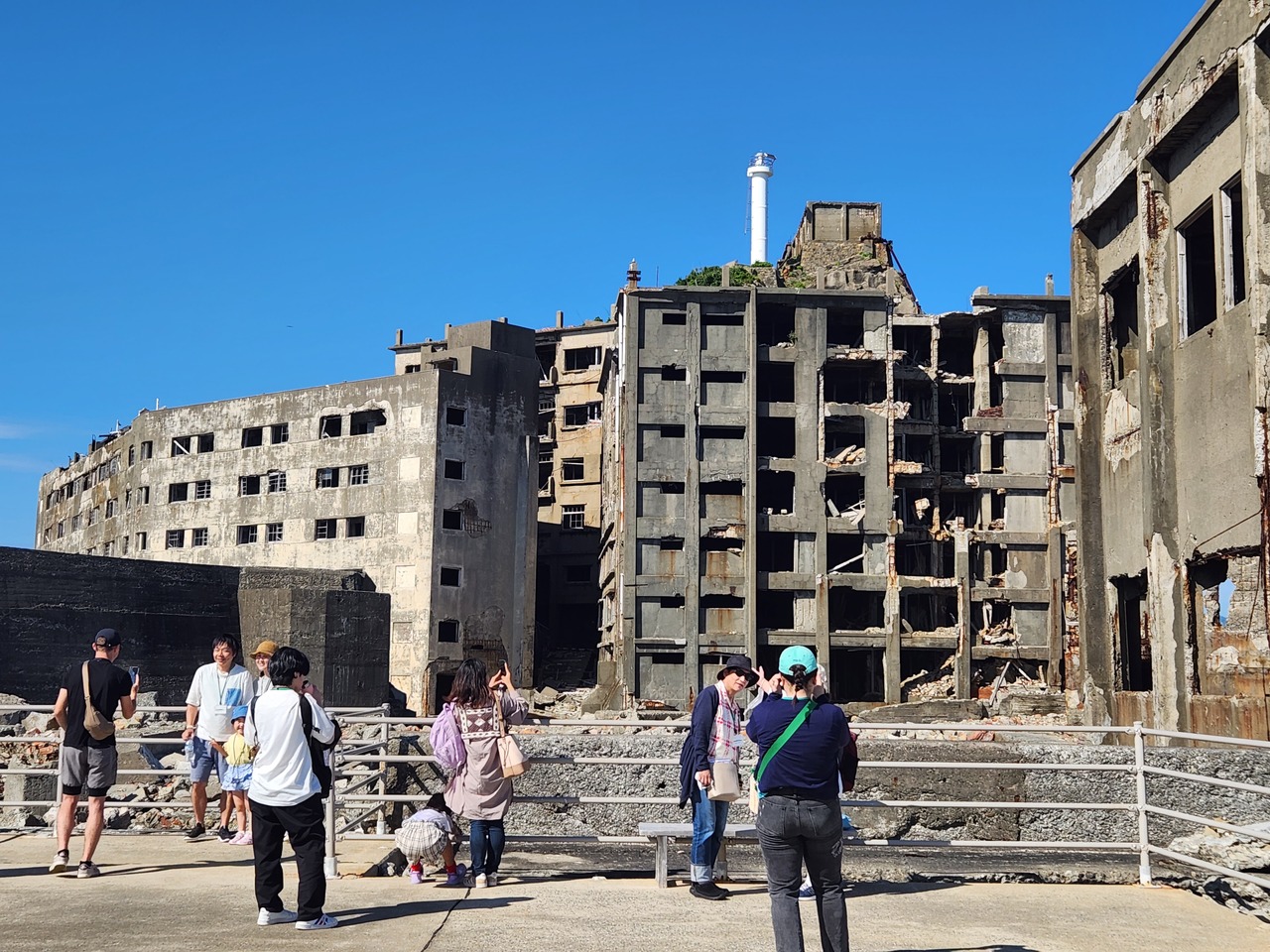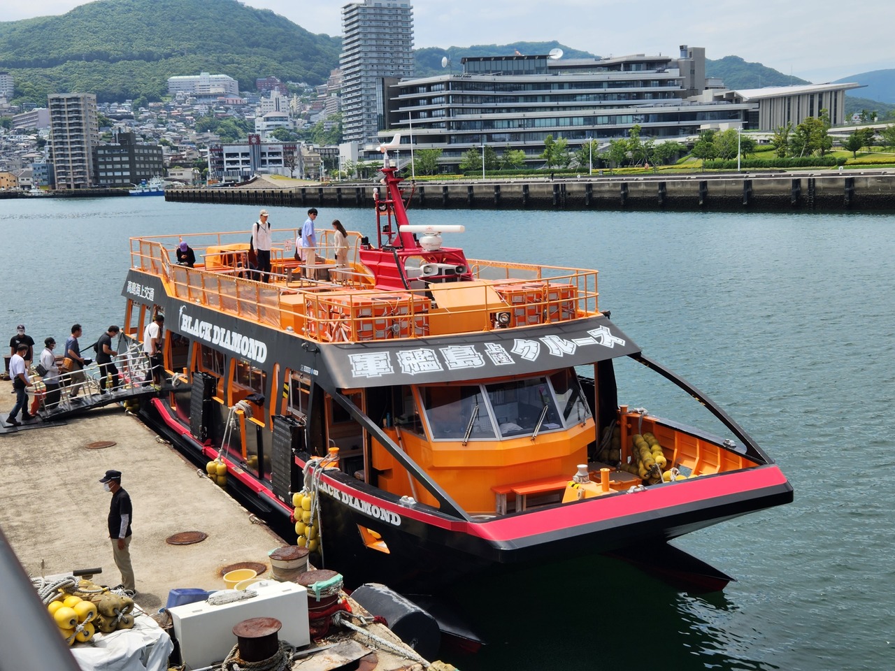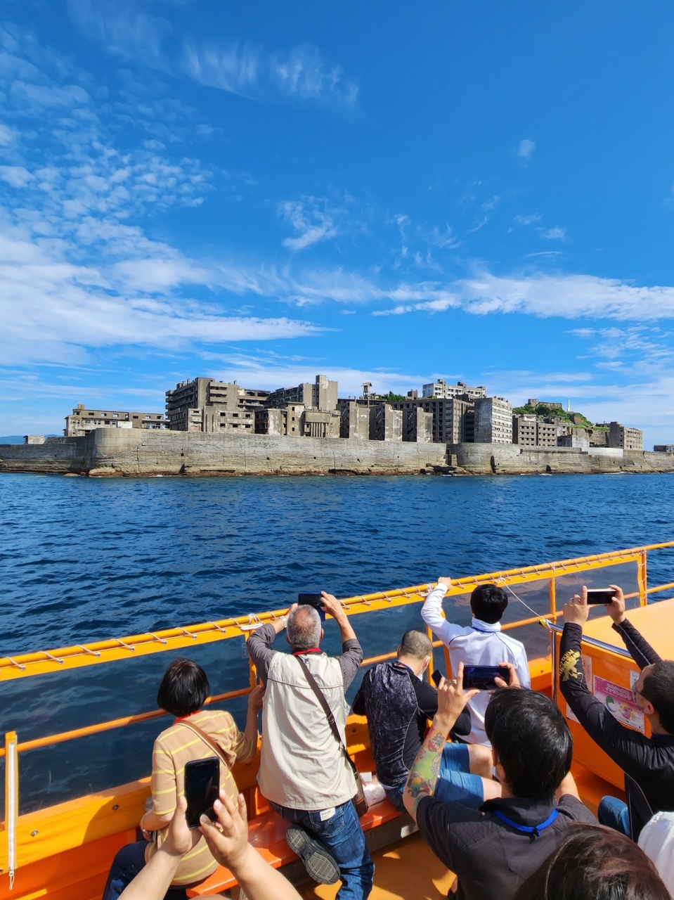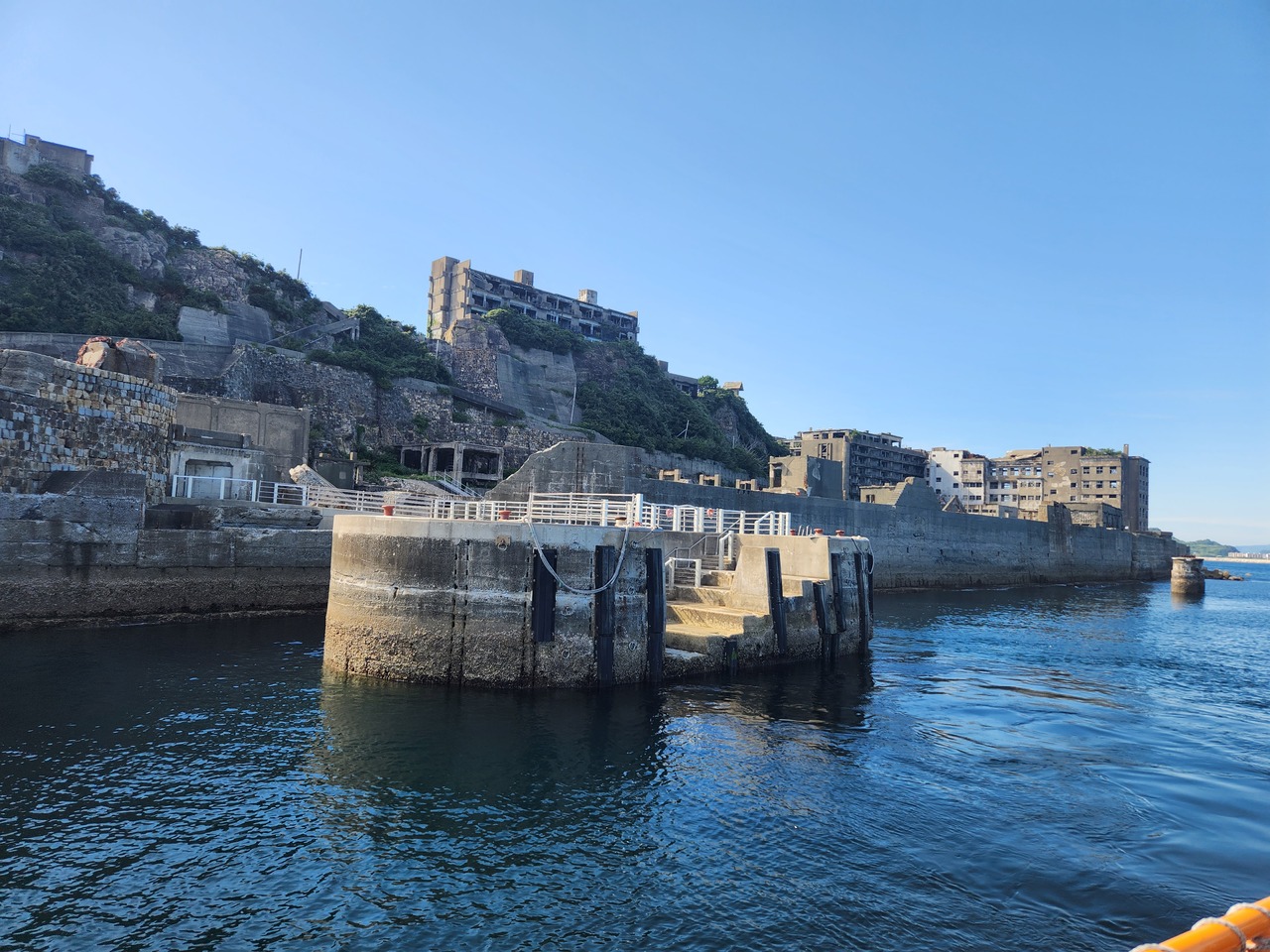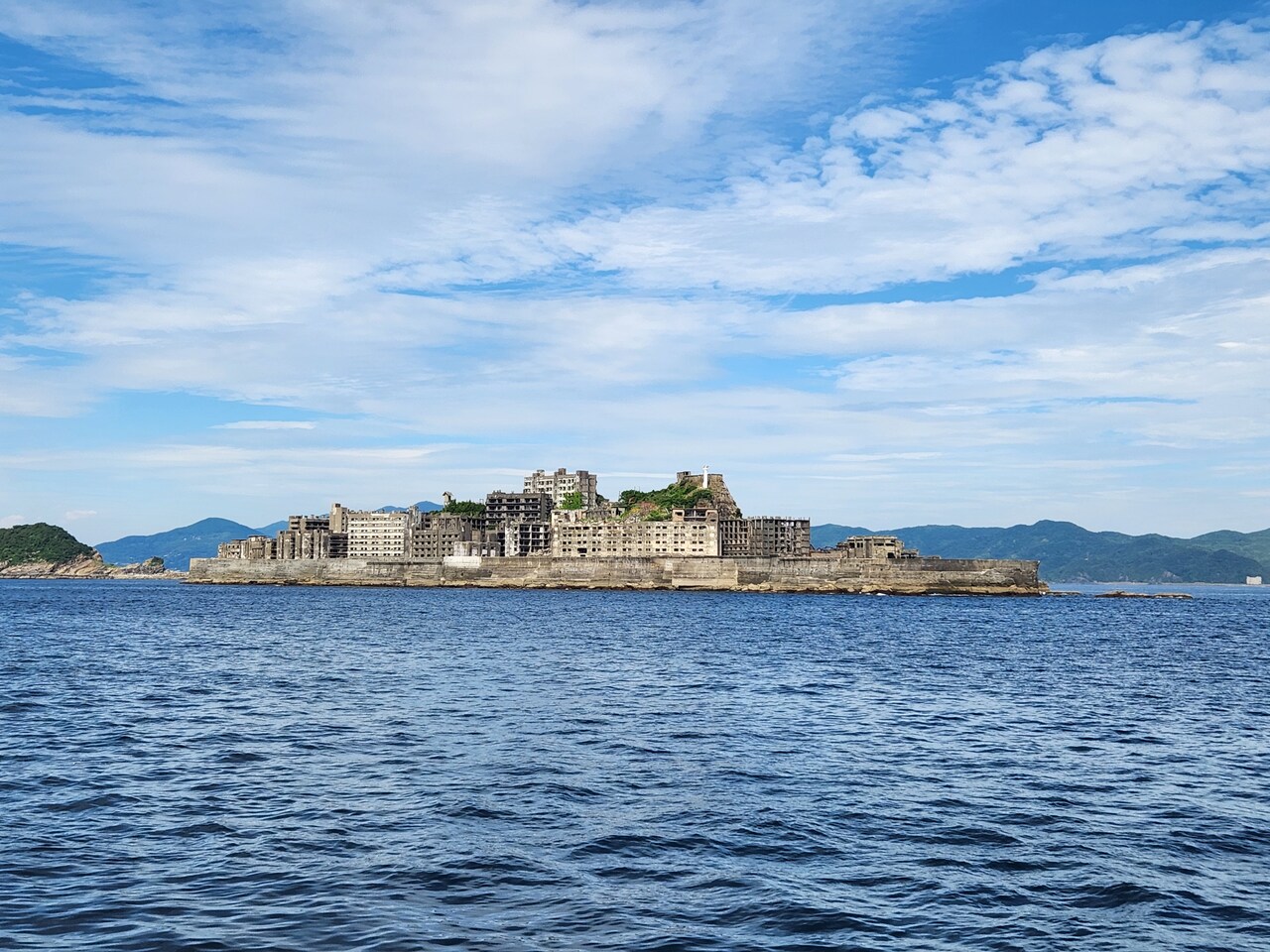 長崎の港から端島(通称、軍艦島)を見学するツアーです。市内に4~5社のクルーズ船が毎日午前午後と運航しています。私はブラックダイアモンド号を利用しました。日曜日だったので混んでいましたが、晴天に恵まれ海が穏やかで上陸できたので大満足です。(前日は晴れでも波が荒く上陸できなかったそうで、翌日からは雨天が続きました) 台風や波、経年劣化で日々崩壊を続ける史跡、上陸できなくなる日も近いかもしれません。端島に着くまでの造船所、イージス艦を見るのも楽しかったです。6月4日