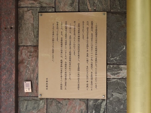 なかなか不思議な史跡ですね。この場所には白河法皇の寵愛を受け、のちの平清盛を生んだといわれる祇園女御の屋敷があったそうです。そして隣接地には阿弥陀堂が建立されていました。説明を読んでわかったのはそこまでで結局「祇園堂」とは何なのか、まるで寺院のように見えない外観ですが、寺院みたいです。