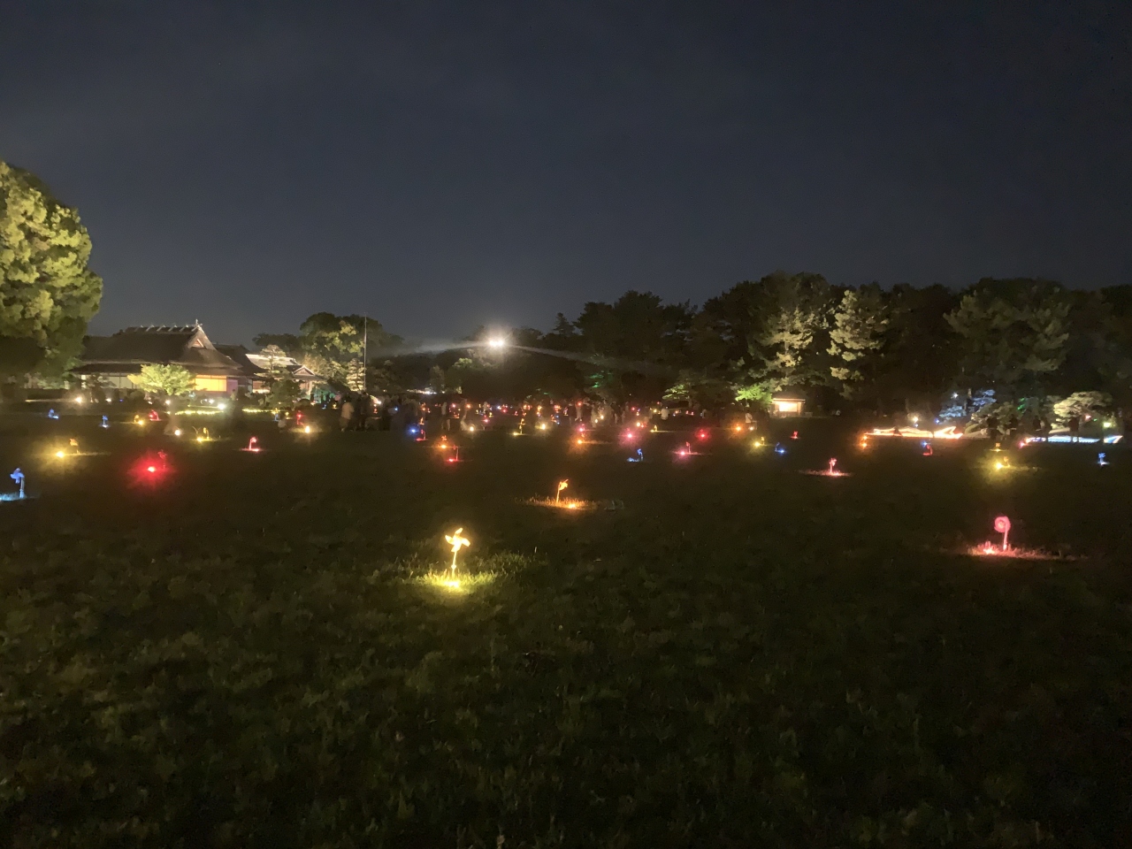 庭園の芝生に植えられている風車が1個1個ライトアップされていてまさに幻想庭園。