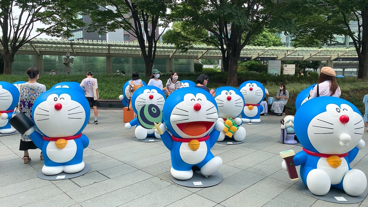 六本木ヒルズでは、テレ朝夏祭り開催中で、色々な道具を持ったドラえもんのモニュメントがそこら中に並べられていました。 子供も大人も大好きなドラえもんなので、写真撮影をしたりして楽しんでいました。 とにかくドラえもんの数が多いので、大人気の道具の前では待ちが発生していましたけど、拘らなければ特に並ばずに写真撮れました。