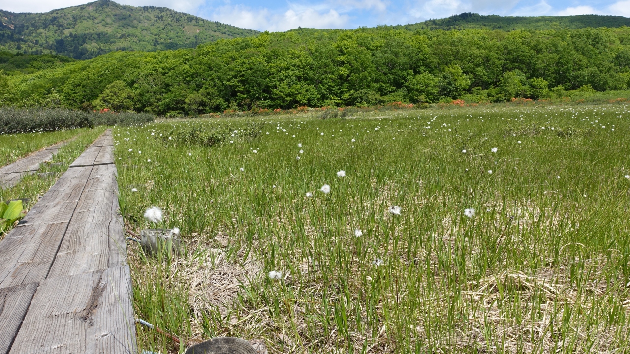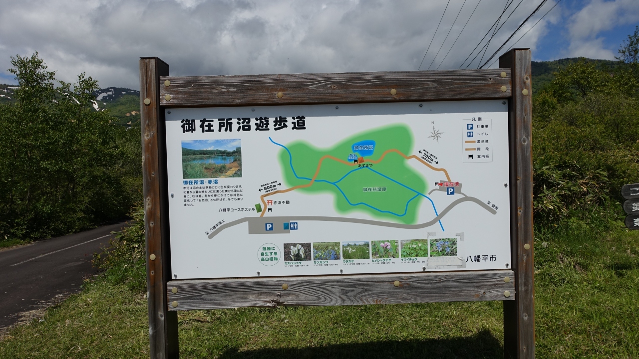 御在所園地は八幡平の高原湿原では一番東に位置する。八幡平アスピーテラインの松尾 八幡平地熱発電所近くに2か所の駐車場がある。園地内には木道があり低木の樹林滞や広々とした湿原の中を歩く。6月には新緑の中でワタスゲとレンゲツツジが美しい。木道の中間点に御在所沼と赤沼という美しい2つの沼がある。沼はいずれの駐車場からも700~800m程度なので簡単に歩ける。