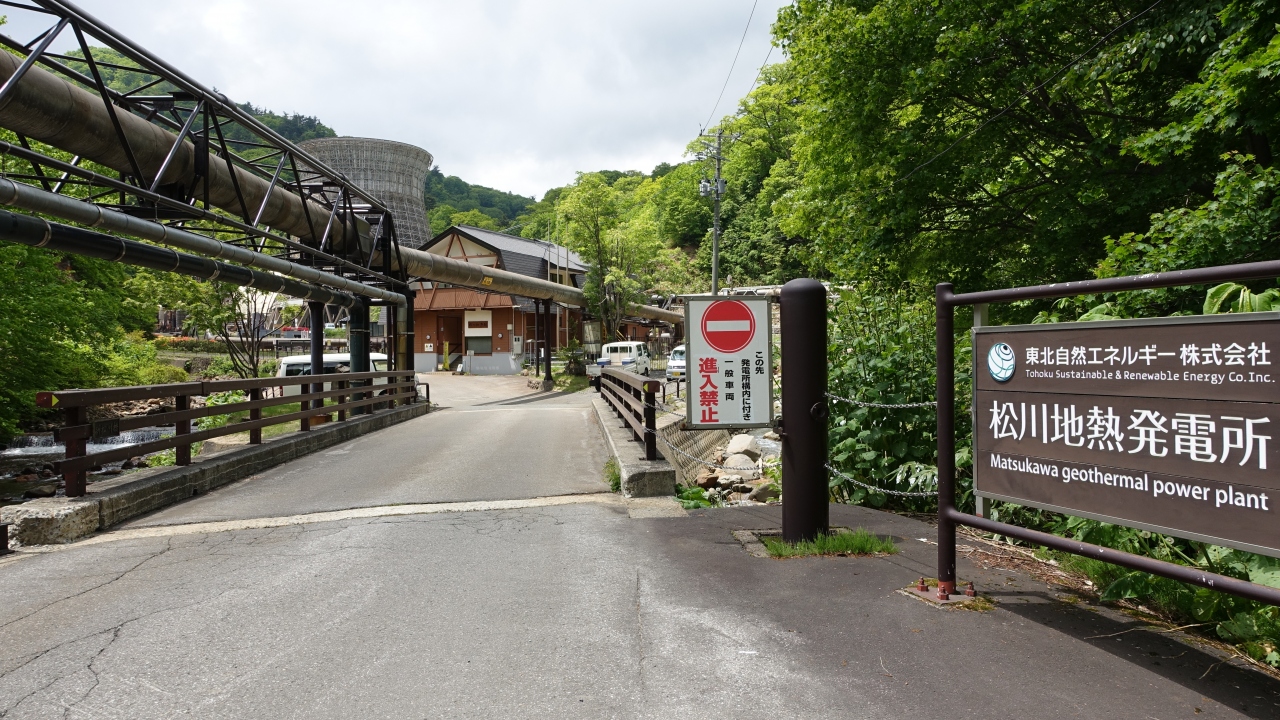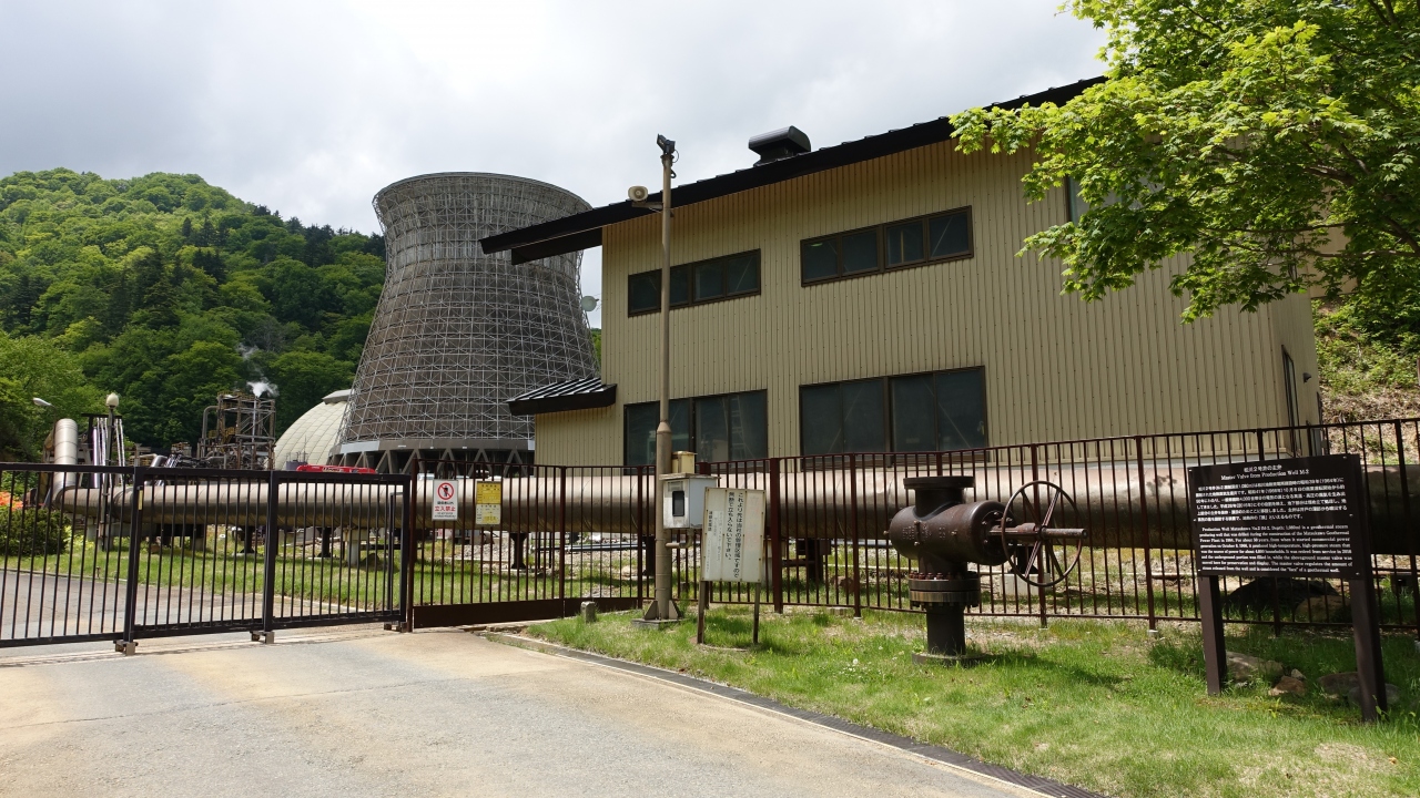 発電所は実際稼働中で太い敷地内を蒸気配管が走る。地熱井から高圧水蒸気を取り出した主弁や巨大な冷却塔を柵越しに見ることが出来る。