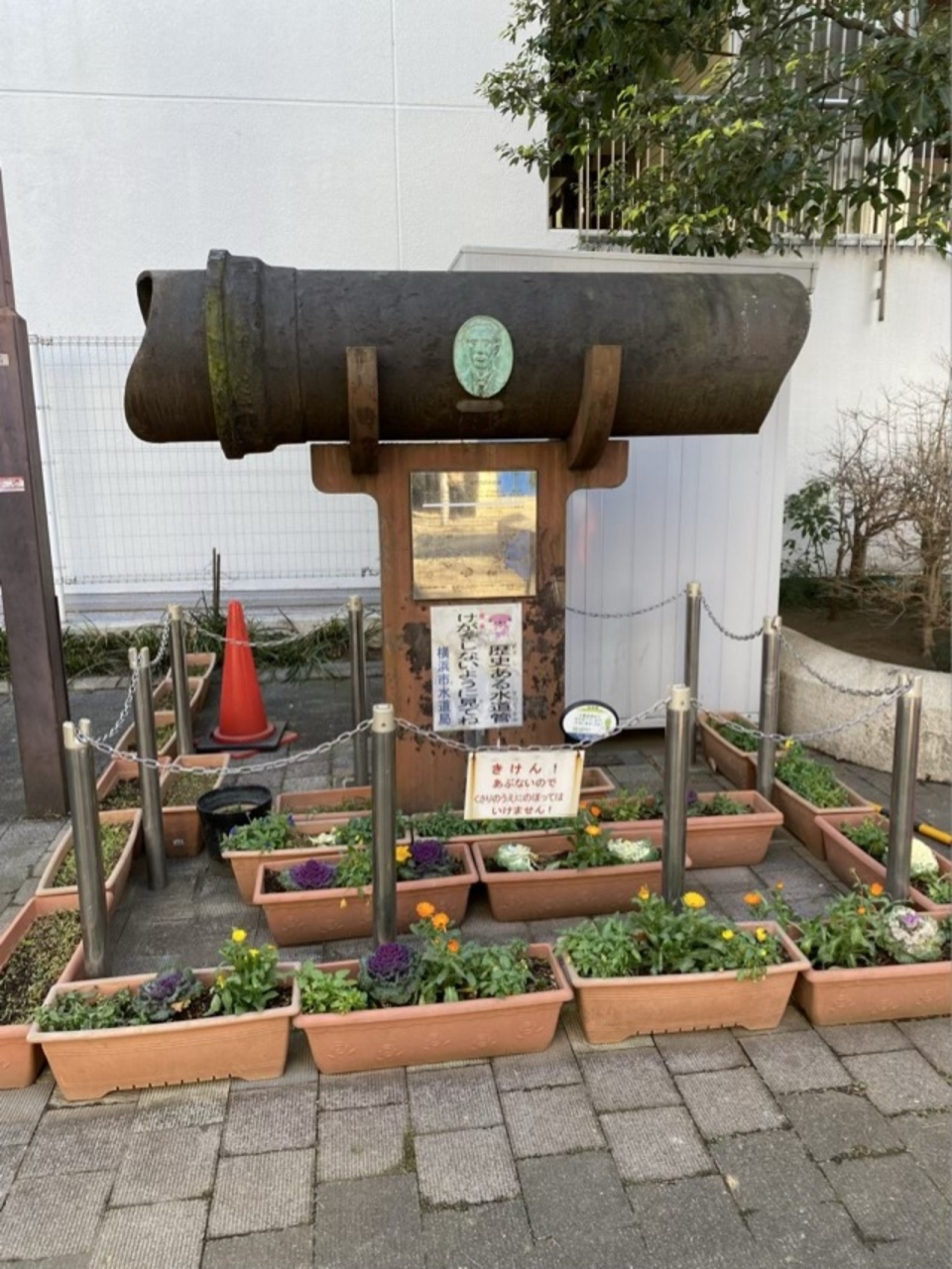 野毛3丁目の交差点から西に一つ入った所にありました。ちょっと奇抜な形のオブジェかなと思ったらふつうに太い水道管が乗っかっているのですね。日本近代水道最古の水道管とのことでさすが発祥の地、横浜です。当時の水道はイギリス人パーマーさんの指導で造られたそうで多くの外国の人に助けられた歴史も改めて感じました。