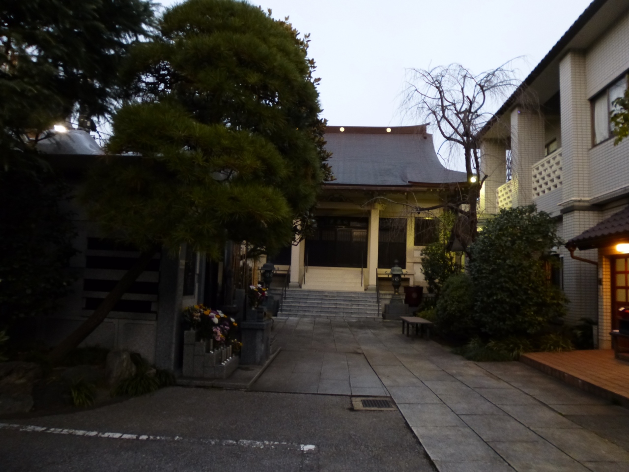 押上駅から歩くと7分ほどのところ、新あづま通り沿いに山門があります。山門から境内を見ると、白いコンクリート造りと大きな屋根の重厚な本堂が見えます。430年前創建といわれる天台宗のお寺です。境内に進んで行くと、お花が多く供えられていて、心落ち着くお寺です。