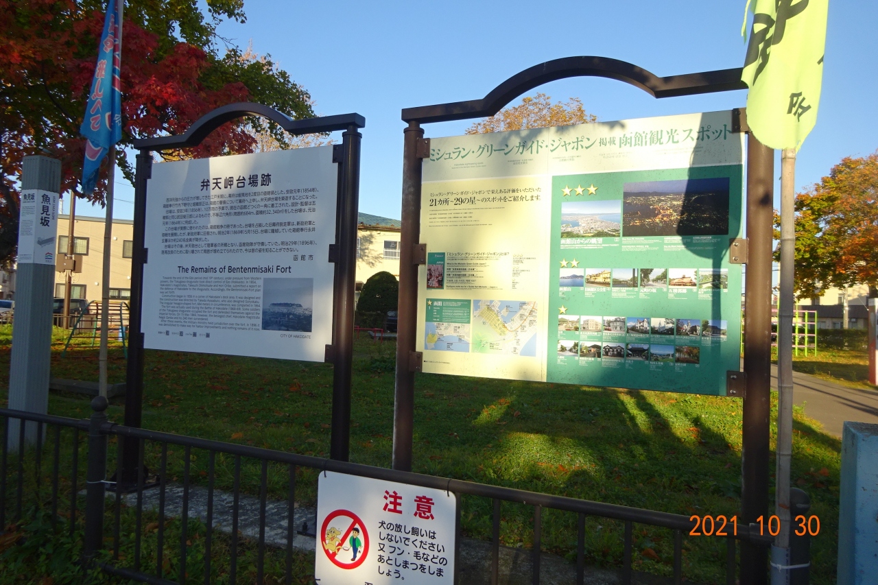 早朝、朝食前の時間を利用し、函館の街を散策しました。その際、路面電車の終点である函館どっく前電停を出発点としましたが、そこから外国人墓地に続く坂、魚見坂の銘板の近くに、弁天台場跡の碑がありました。箱館戦争時、旧幕府軍が陣取った砲台跡とのことでした。