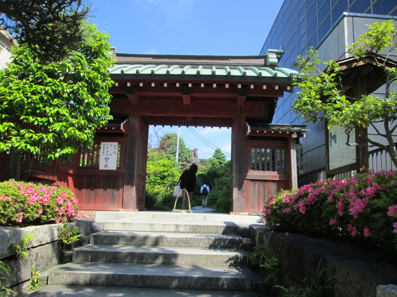 日蓮宗系単立寺院、創建は不詳、開山は日蓮の弟子日澄上人、本尊は産女霊神です。山門を潜り回り込むと本堂があります。安産祈願のお寺です。子供には関係ない年齢ですが、花を見にお寺に入りました。花の寺として一寸有名で、今ツツジとホタルブクロが咲いていました。花ファンには有難いことです。若宮大路に面したところにあるお寺ですが、本堂が大路から離れているので、意外と静かにお参りできました
