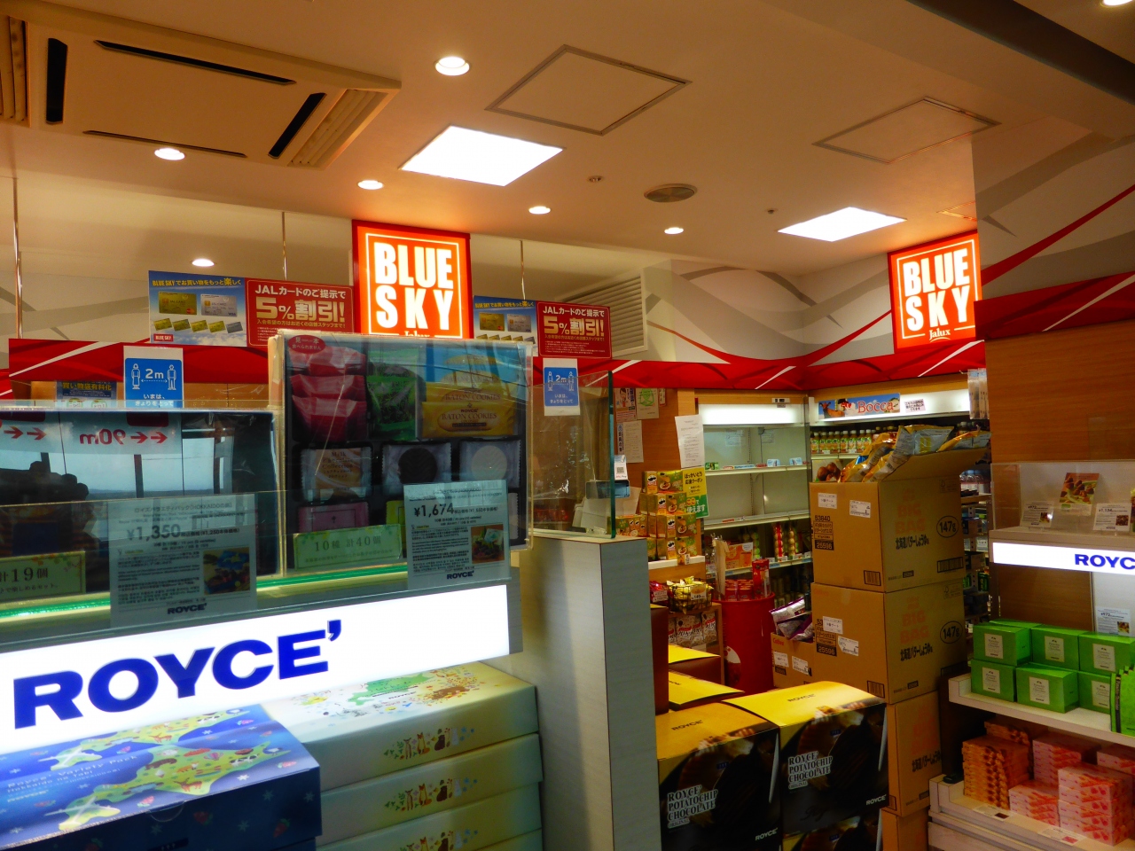 新千歳空港国内線ターミナルビル2FのJAL搭乗口14番ゲート近くにあるブルースカイ。搭乗前の買い忘れに便利です。ドリンク類から空弁、空パン、北海道の銘菓各種が揃っています。人気のじゃがポックルが売られています。