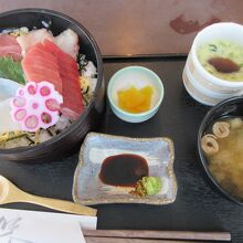 値段はわかりませんが、イカ・まぐろ・白身魚の海鮮丼を頂きました、茶わん蒸し・みそ汁付き。