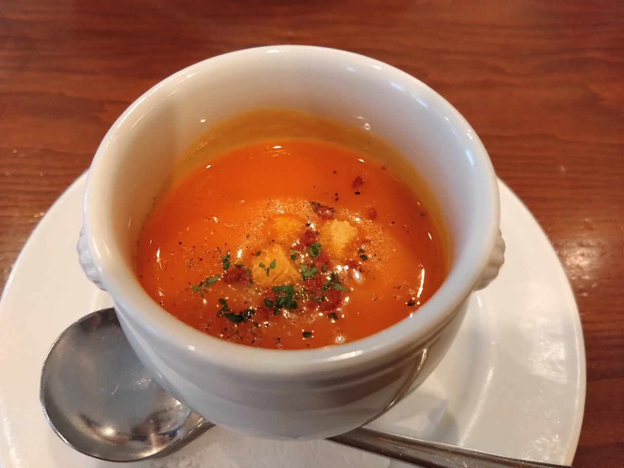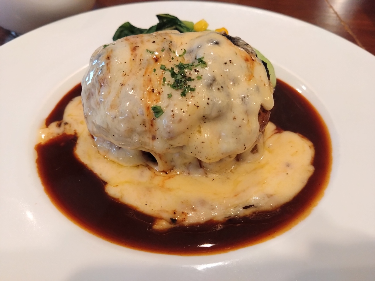 ハンバーグランチです。サラダ、本日のスープのトマトの冷製スープ、とろけるチーズとジューシーなハンバーグとデミグラスソース、おかわりできるパン。クーポン提示で一口デザートのパンナコッタ。珈琲も追加し、どれも美味しくいただきました。