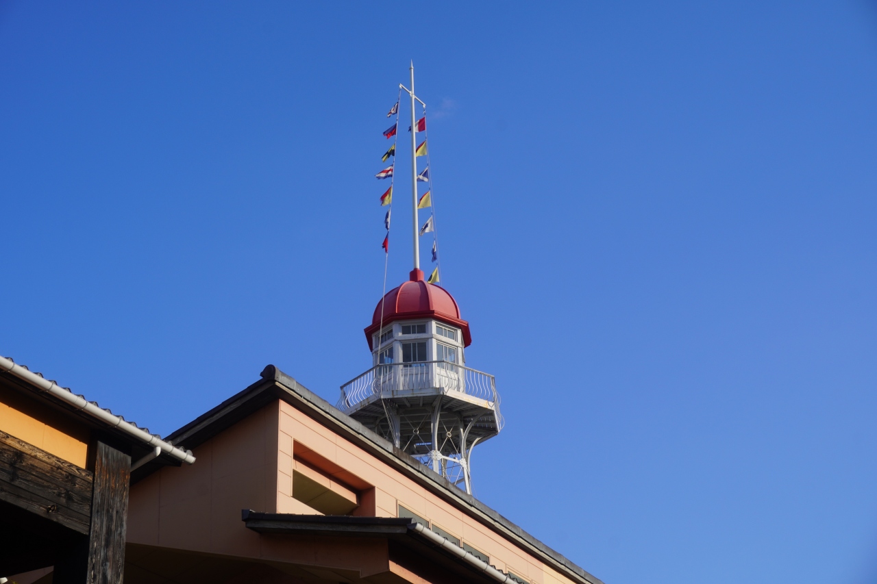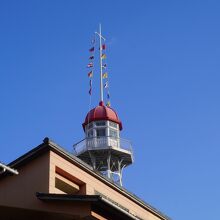 鉄塔の上に建つ赤い屋根の小さな望楼。大正3年のもので、ここから神戸港に出入りする船舶を監視していたということです。今では、ハーバーランドのショッピングセンター、モザイクの象徴のような感じ。下から見上げると先端の避雷針のような突起も併せて、青空によく映えています。