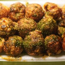 たこ焼きはちょっと小さめですが、ソースの味やベースの出汁味も濃いめですね。温かいうちはいいですが、冷えると味の濃いのがちょっと気になります。
