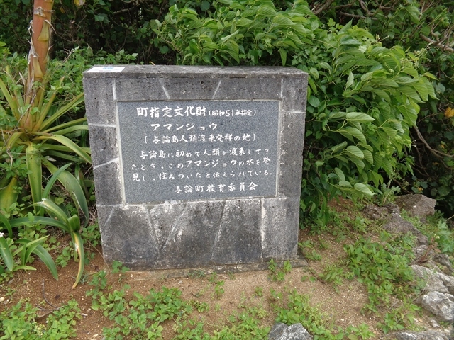 与論島人類渡来発祥の地で,与論島に初めて人類が渡来してきたとき,このアマンジョウの水を発見して住み着くようになったそうです.歴史的にはとても重要な場所なのだと思いますが,道路脇にポツンとあるだけで,案内板がなかったら通り過ぎていたかも知れません.当然,わざわざこれを見に来る人もいないようで,チョットもったいないような気がしました.