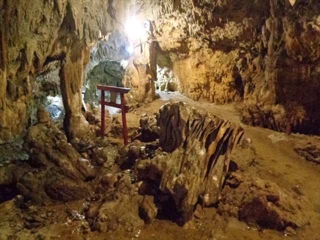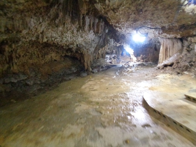 長さは120mくらいの鍾乳洞だそうです.入り口で料金を支払うと,その場でヘルメットと懐中電灯を貸してくれました.でも,鍾乳洞内部にも電灯が灯っていたので,どうしても必要というほどではありませんでした.また,ヘルメットも,気を付けて歩けば,頭がぶつかるような場所はほぼないと思います.洞の内部は足下が結構ぬかるんでいるので,頭よりも足の方に気を付ける必要があると思います.それ程広い鍾乳洞ではないので,20分くらいあれば十分見て回れると思います.