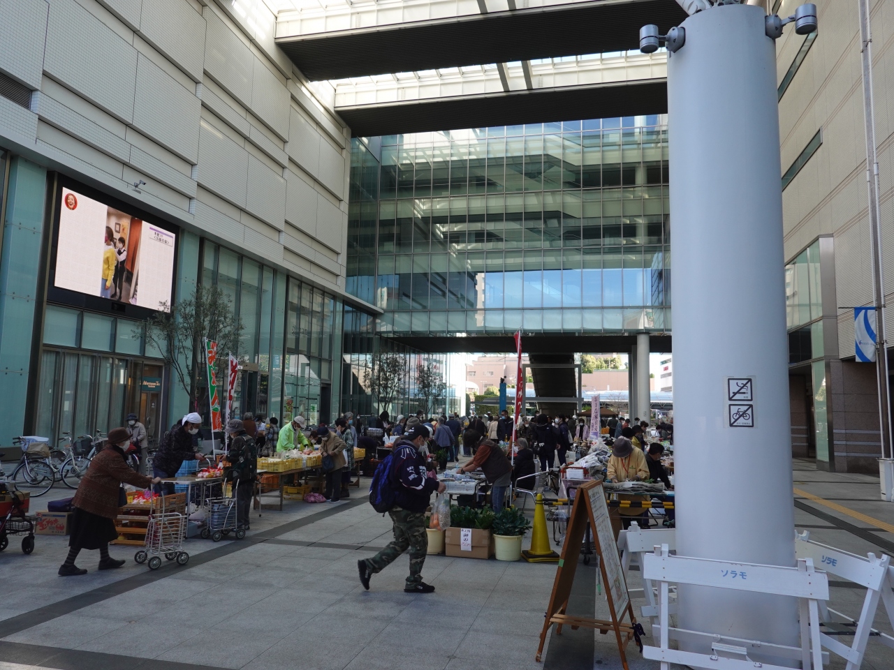 「ソラモ」は浜松駅前にある大屋根をつけた全天候型のイベントスペースです。平日の朝9時過ぎに訪れましたが、野菜や果物、その他食料品を売るお店がたくさん出ており多くの人で賑わっていました。休日にはライブなども行われるようですが、天井が高く開放的な雰囲気が良いと思いました。