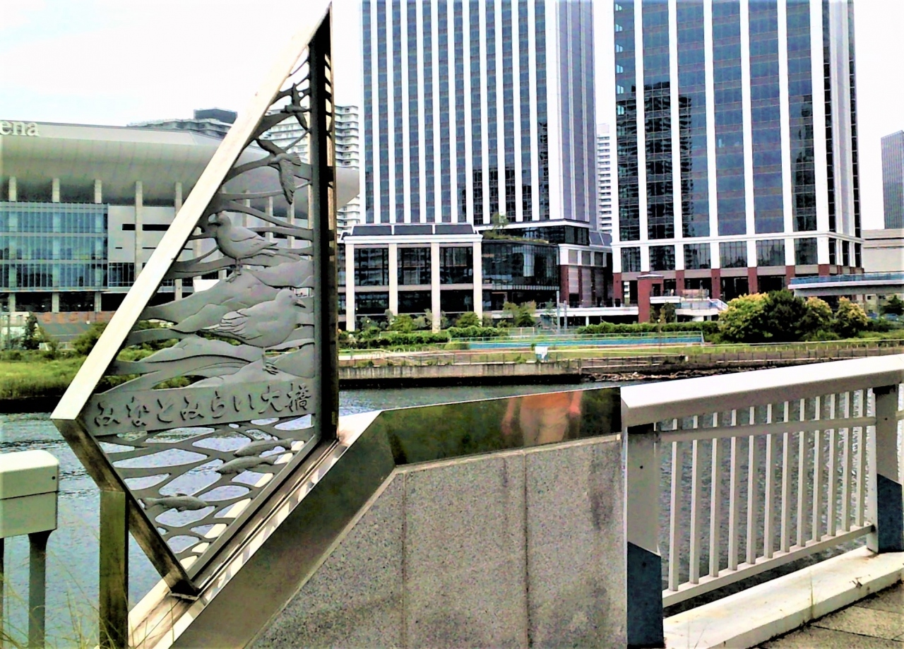 帷子川親水エリア(ポートサイド公園)を通り大橋に…欄干にモニュメント[みなとみらい大橋]が;下側は川/真ん中に`みなとみらい大橋`/上部にカモメ(or鳩?)/富士山!のモニュメントが♪ 車道(お世話になっております)の横には、歩道と自転レーンがあり安心でした☆