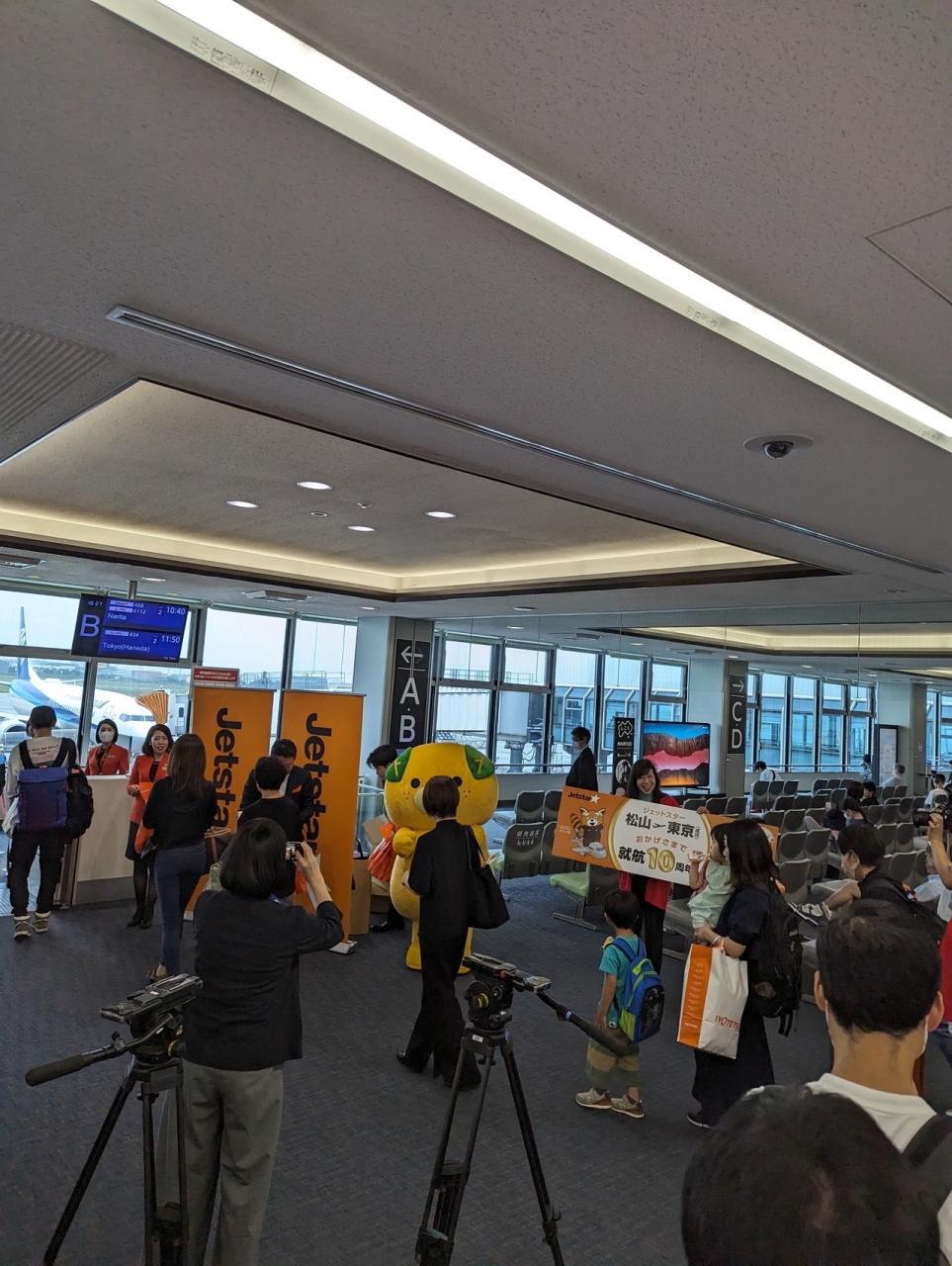 規模は小さくはないが、やはり地方空港であり路線の就航状況は決して良くはない。そんな中で10年間運航を続けたジェットスター・ジャパンに対する感謝の思いはあって当然かも知れない。しかし空港の施設規模としては公式発表されている程の余裕は感じられず、ちょうどジェットスター・ジャパンの搭乗口が保安検査場の真ん前という場所だったために、イベント参加の人だかりが保安検査場の通過者に対して邪魔になっていることが目についた。ボーディングブリッジは他にもあるので敢えてこの場所にする必要性は感じられないが、そこまでは主催者側も考えてはいなかったとしか思えない光景であった。