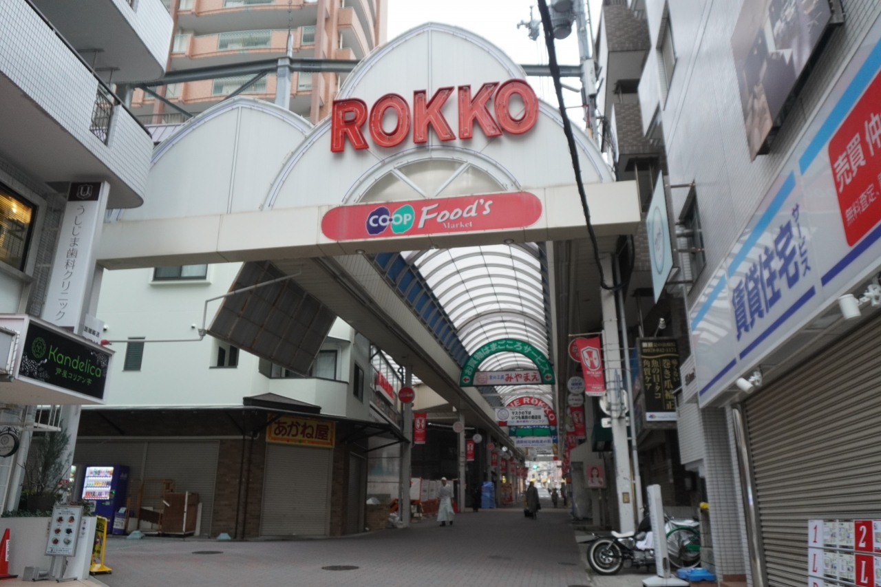 六甲本通商店街は、IR六甲道駅から北に向かってすぐのアーケード商店街。そんなに大きくもないし、そんなに賑わってもいないように思いますが、入り口の「ROKKO」の看板の構えにはインパクトがありますね。緩やかな上りになっているのが六甲っぽいかなと思います。