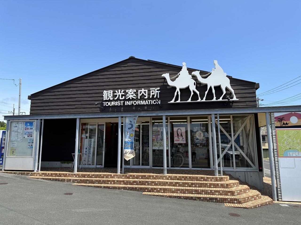 JR御宿駅の改札口を出てすぐのところ、プレハブ造りのような建物の観光案内所があります。御宿は、童謡「月の沙漠」のモデルとなった所であることから、王子と姫が乗った2頭のラクダが、観光案内所の看板になっています。建物の中には、レンタサイクルのための自転車がたくさん並んでいました。