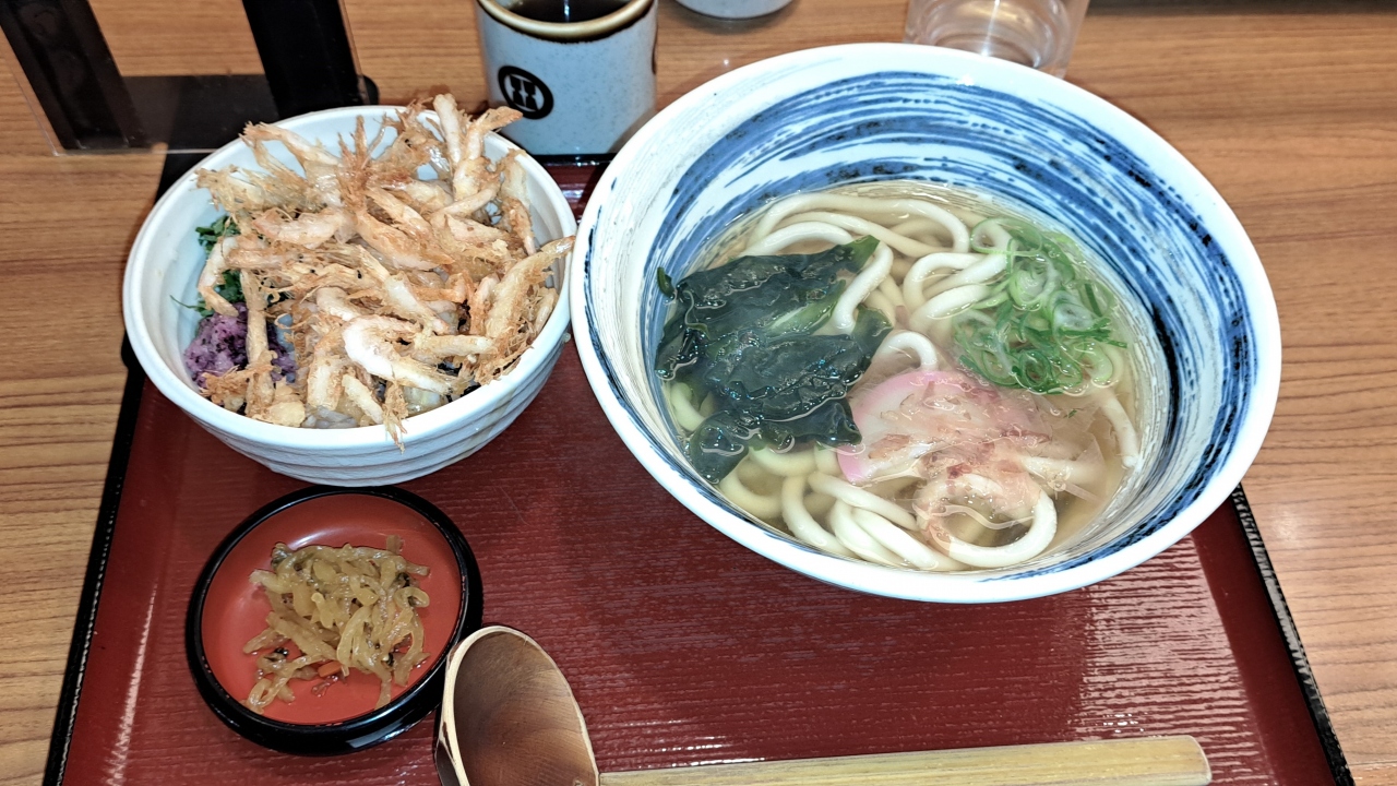小さな白エビの天ぷら丼がついたうどんを食べました。チェーン店と言ってもここは地元の味があってよかったです。食前の薬を飲もうと思って最初にだされたお茶に手を出そうとしたら「今お水もってきますよ」とさりげなくしかもしっかり客の動きを見て声かけしてくれて素晴らしいと思いました。
