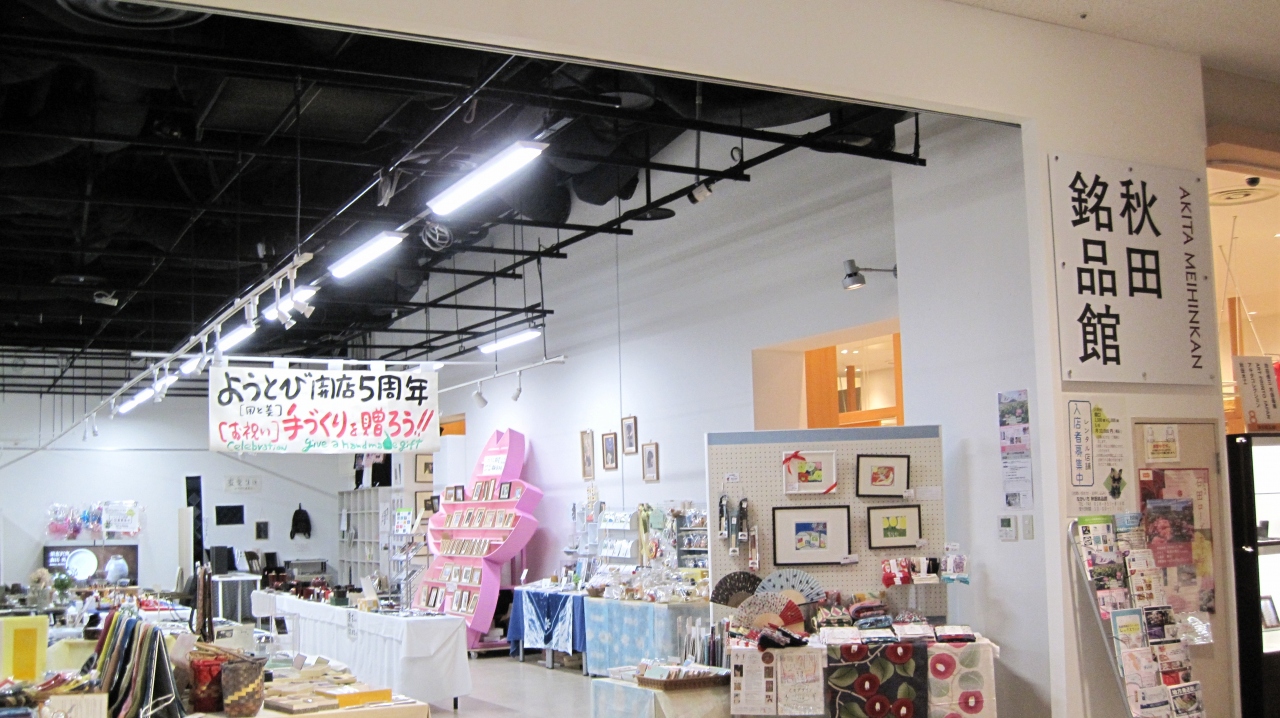 秋田駅から徒歩10分にあり、カフェやレストラン、土産物、、個人作家の作品を集めた銘品館、衣料品店、秋田犬ステーション等、色々な店舗が入り、Youtubeで紹介されたお店もありました。すぐ前に県立美術館、横にはにぎわい交流館AUもあります。