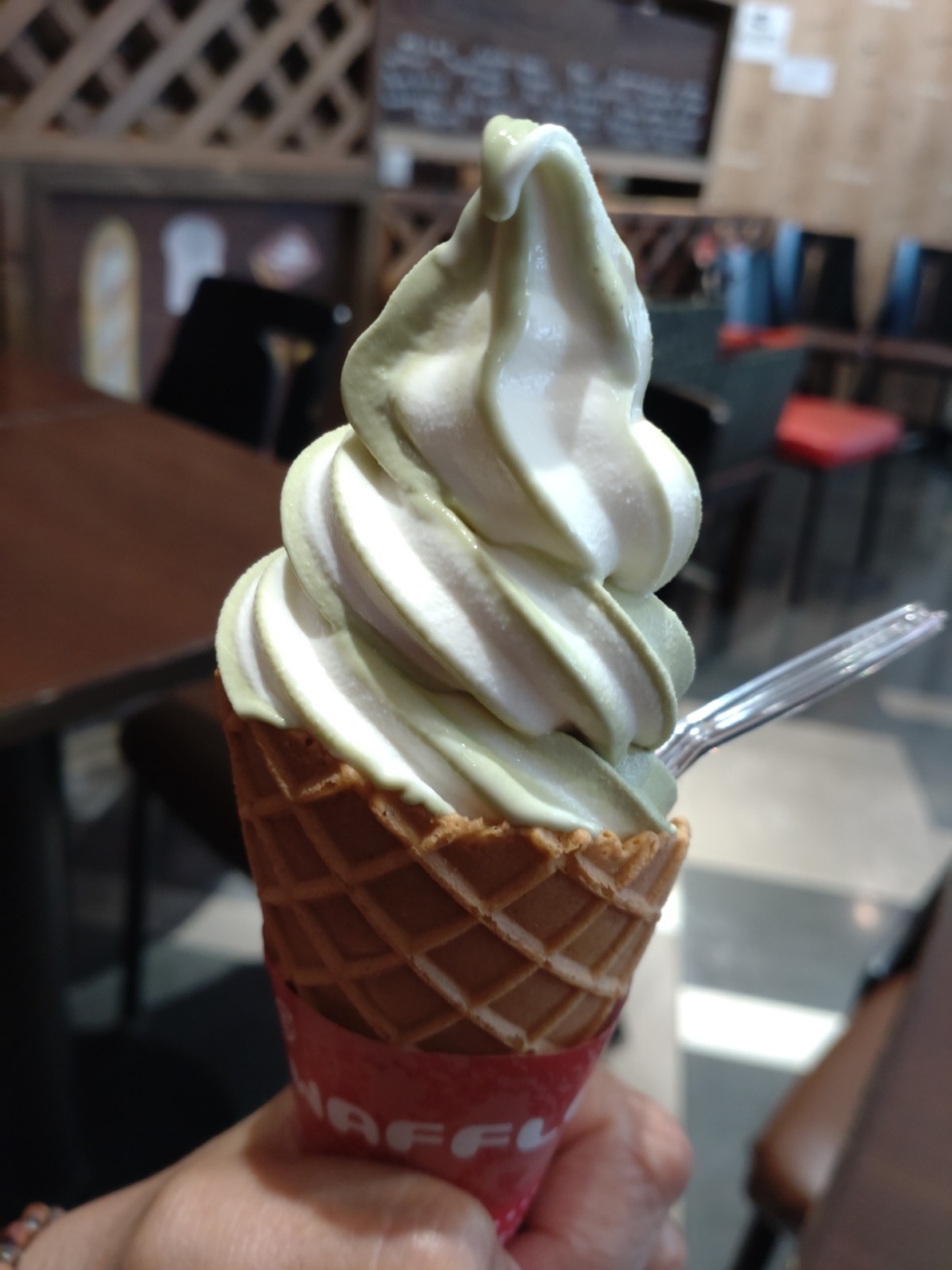 ベーカリーSHOPで店内飲食出来るスペースもあり、昼食時間帯は混雑してました。ソフトドリンクの他に流行りのピスタチオソフトもあり、食後のデザートで立ち寄りました。ピスタチオとバニラのMIXは甘過ぎず美味しかったです。