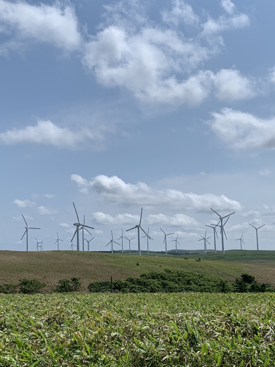宗谷丘陵からは雄大な利尻山や真っ青なオホーツク海が見えてそれは絶景です。下を見れば真っ白な道です。付近は開放的な牧場もあり57基の大風車が見えます。天国みたいです。氷河期の地盤の凍結と融解の繰り返しによって土がゆっくりと動くことでつくられた周氷河地形と呼ばれる地形で、稜線が丸みを帯びたその美しい景観は北海道遺産に指定されています。