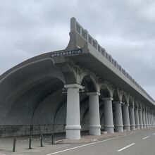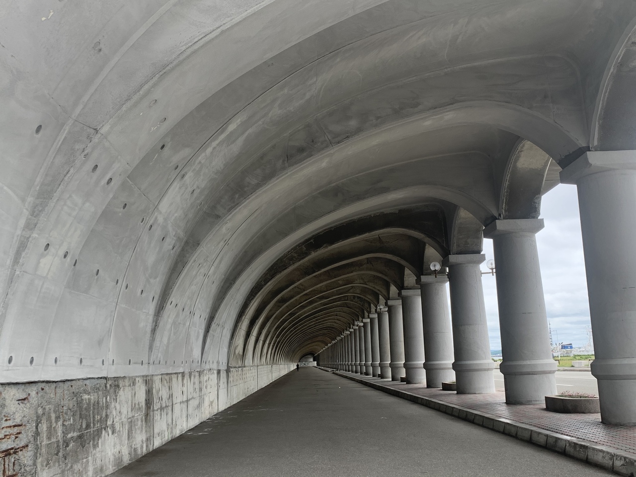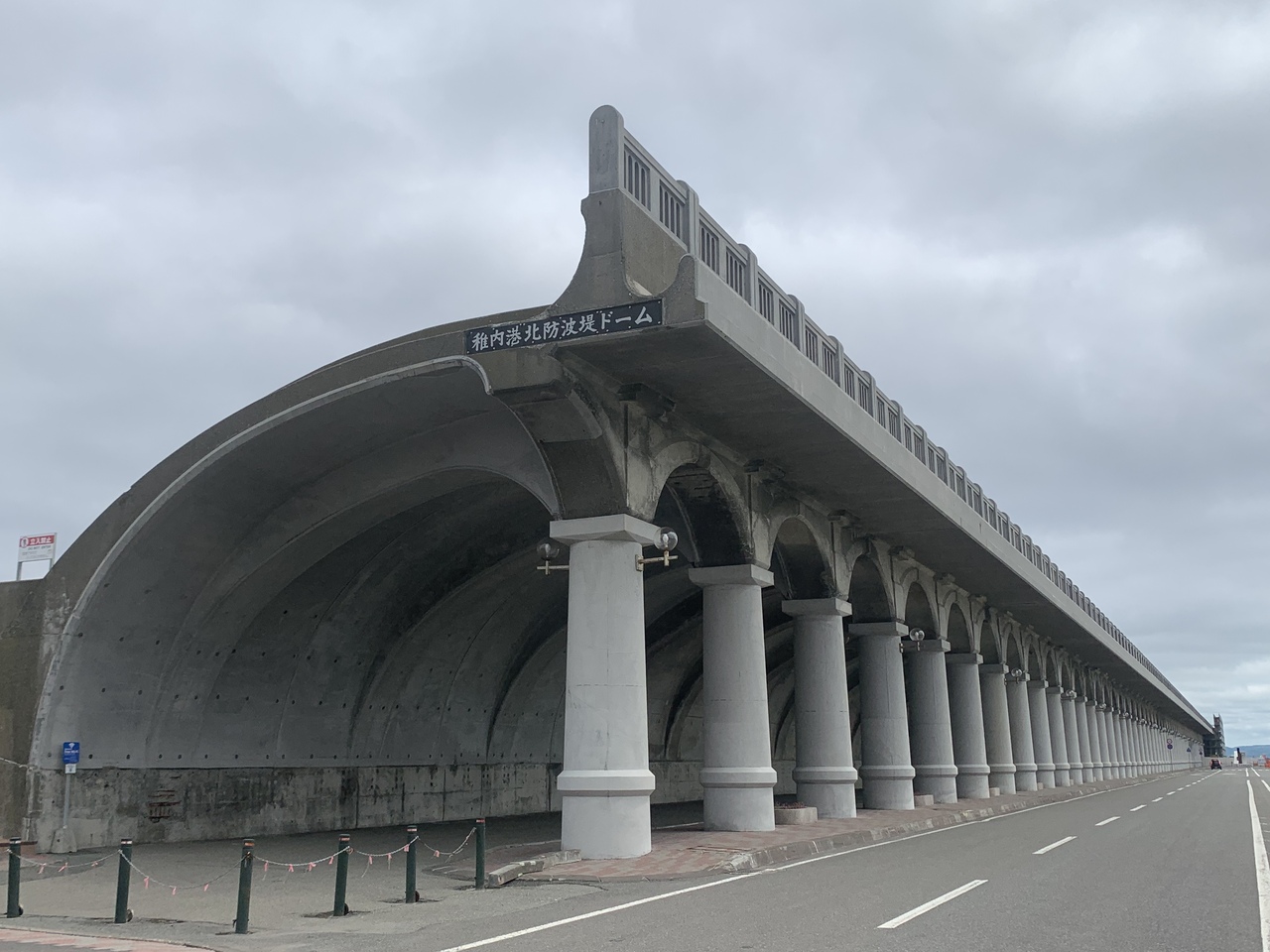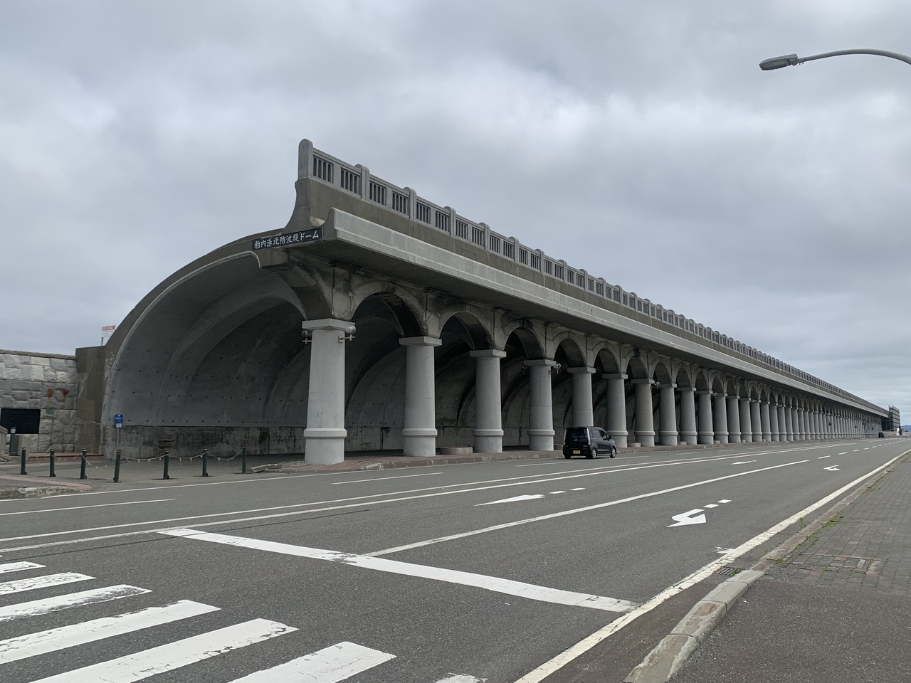 稚内駅から徒歩5分くらいの海沿いにあるドーム型の防波堤です。樺太への航路がにぎわっていた当時にフェリー待ちの人々を強風と荒波から守るために昭和11年に造られた歴史的建造物です。半アーチ型の屋根と太い円柱がローマ建築のようで映画やCMの撮影場所にも使われているそうです。