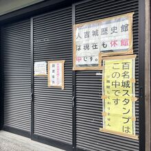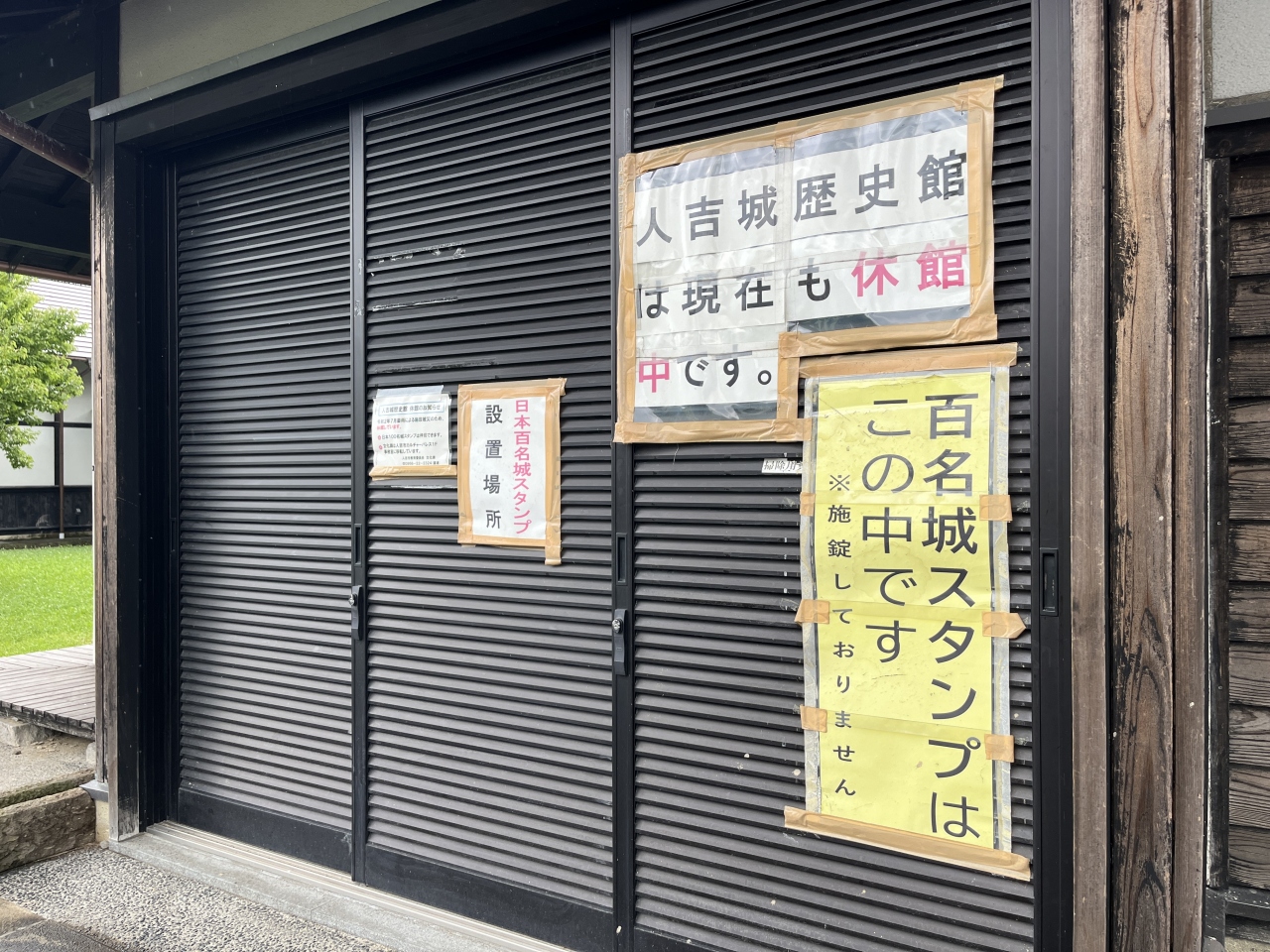 2023年7月初旬に行きました。まだ休館中のようでしたが、ガレージのようなところに日本100名城のスタンプが置かれていました。同じところに水害の際に水がどの高さまできたのかが示されていて、大きな被害を受けたことがうかがわれました。