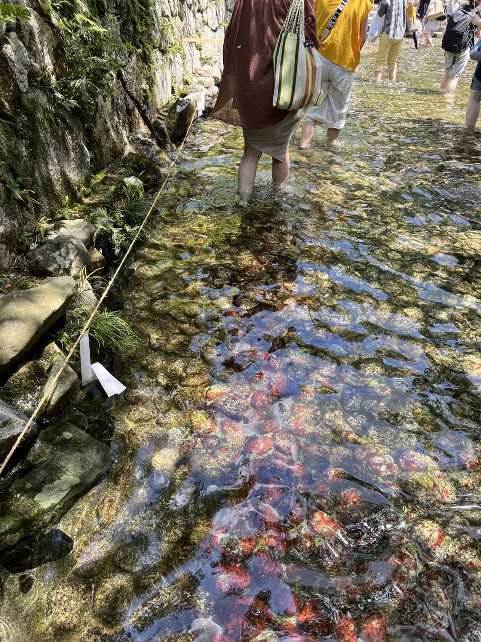 綺麗な玉敷きの池底をゆっくりと進み、この日は気温33度ほどの炎天下でも足首まで浸かる冷水で全身が冷やされました。