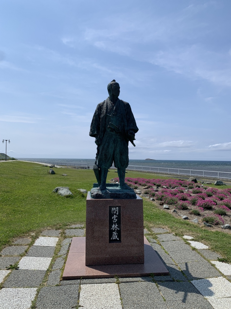 宗谷岬にあります。有名な探検家、間宮林蔵の像が建っていました。実物より2割ほど大きい高さ2メートルあります。サハリンへ渡る決意を秘めはるかサハリンを見ている姿です。羽織はかま、足袋、二本差しと肩に測量用の器具をかけていて当時を表していました。