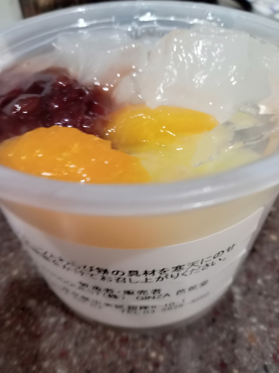 わらび餅入りのあんみつなど購入。銀座シックスは三越や松屋のデパ地下より空いているのでいいです。わらび餅は普通、あんみつは普通のあんみつの求肥のかわりにわらび餅という感じでした。どれも普通においしかったです。