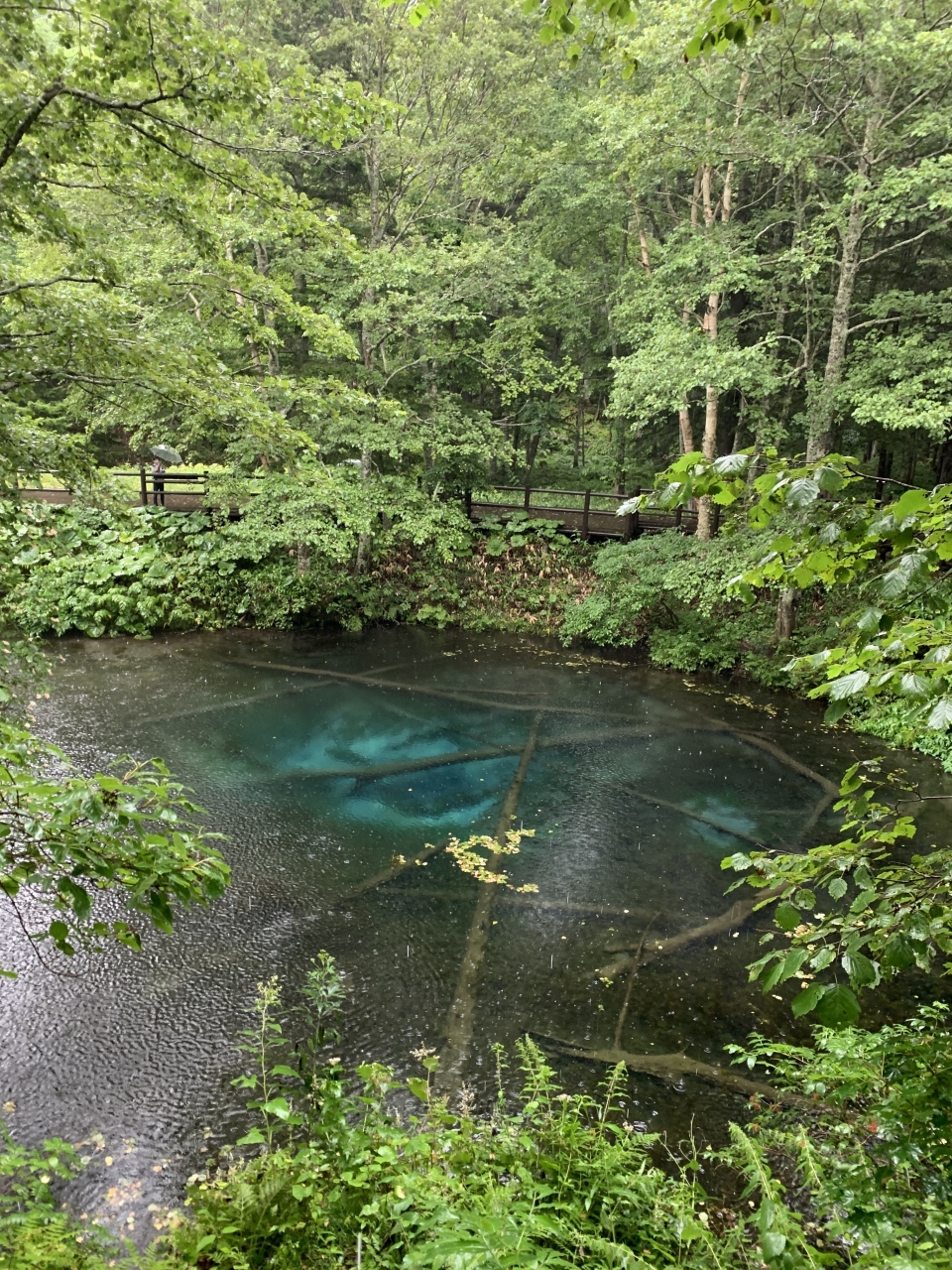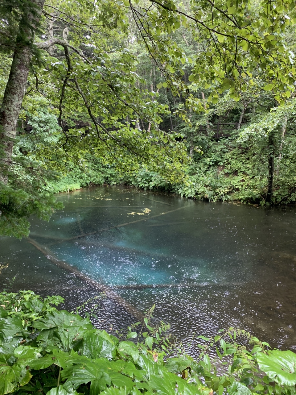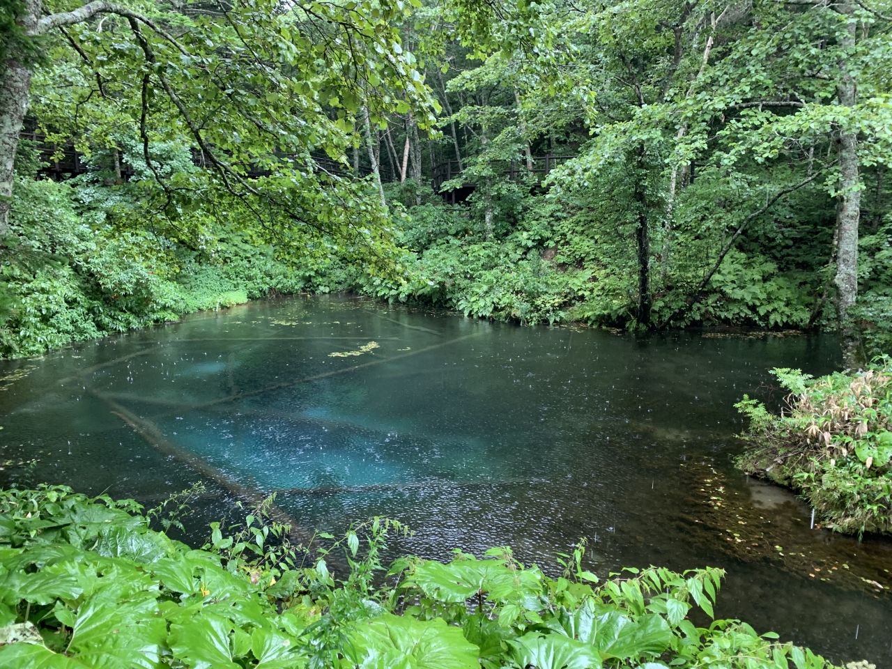 川湯温泉から北上して清里町に入り、「神の子池」に立ち寄りました。細い砂利道を通って駐車場へ向かいますが、砂利道では脱輪している車がいましたので要注意です。駐車場からは遊歩道ですぐ。天気が雨だったため青さ全開とはいきませんが、それでもかなり青かったです。アイヌ語でカムイトー(神の湖)を意味する摩周湖、その地下水による青い水をたたえるとされている池です。なので「神の子池」と呼ばれるのだとか。伏流水は1日に1万2千トンも湧き出すそうで、画像のように溢れ出してました。ひどくない雨ならあきらめずに訪れることをお勧めします。