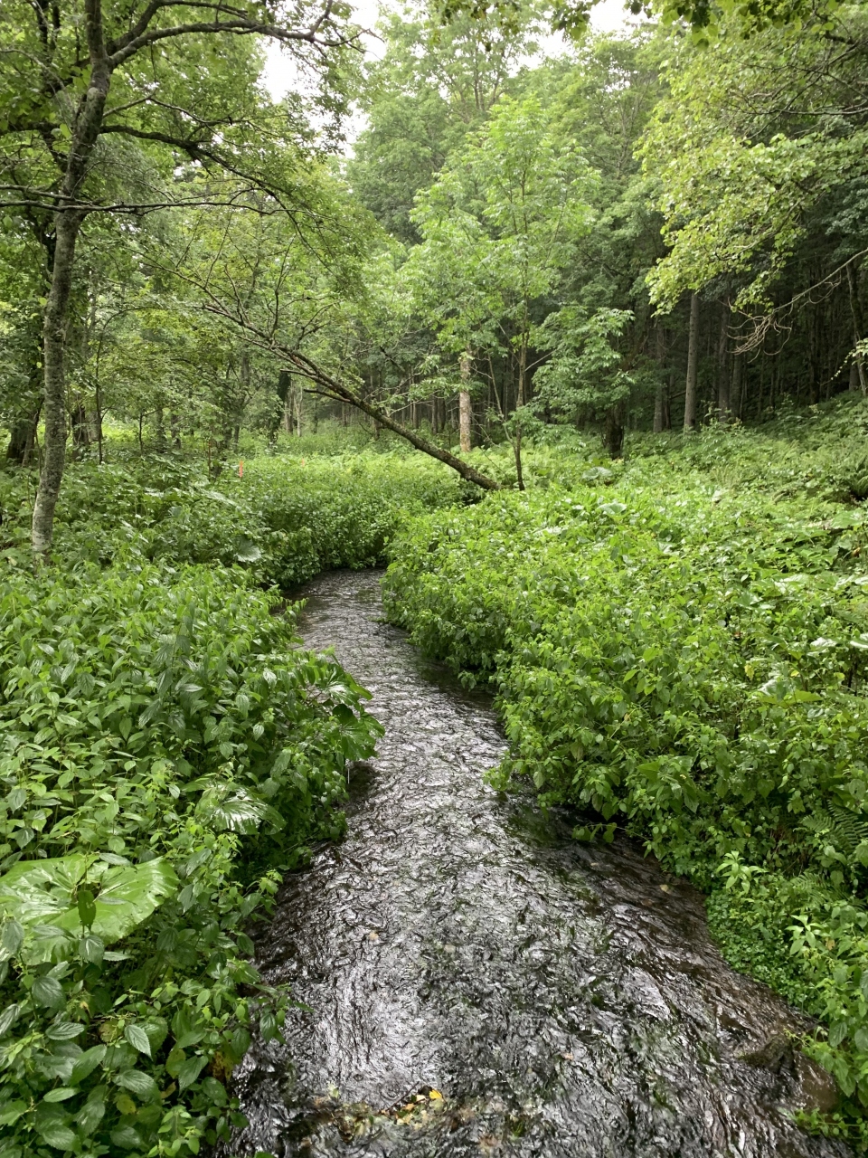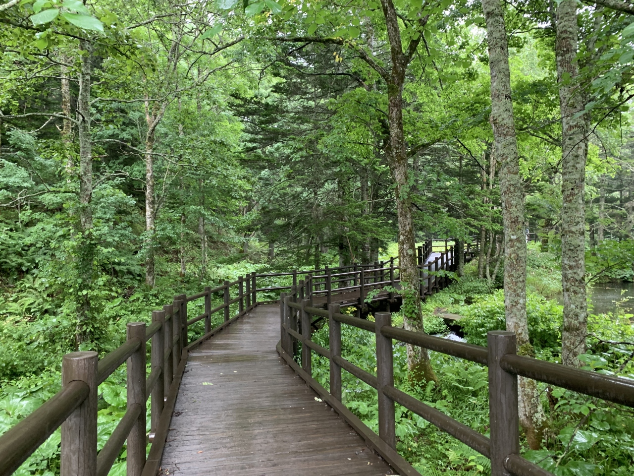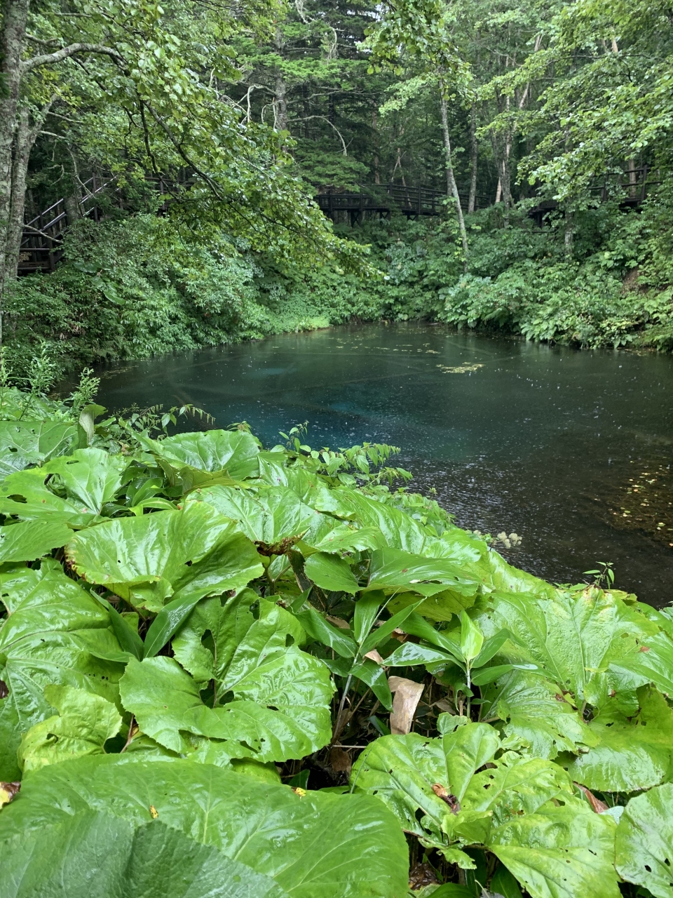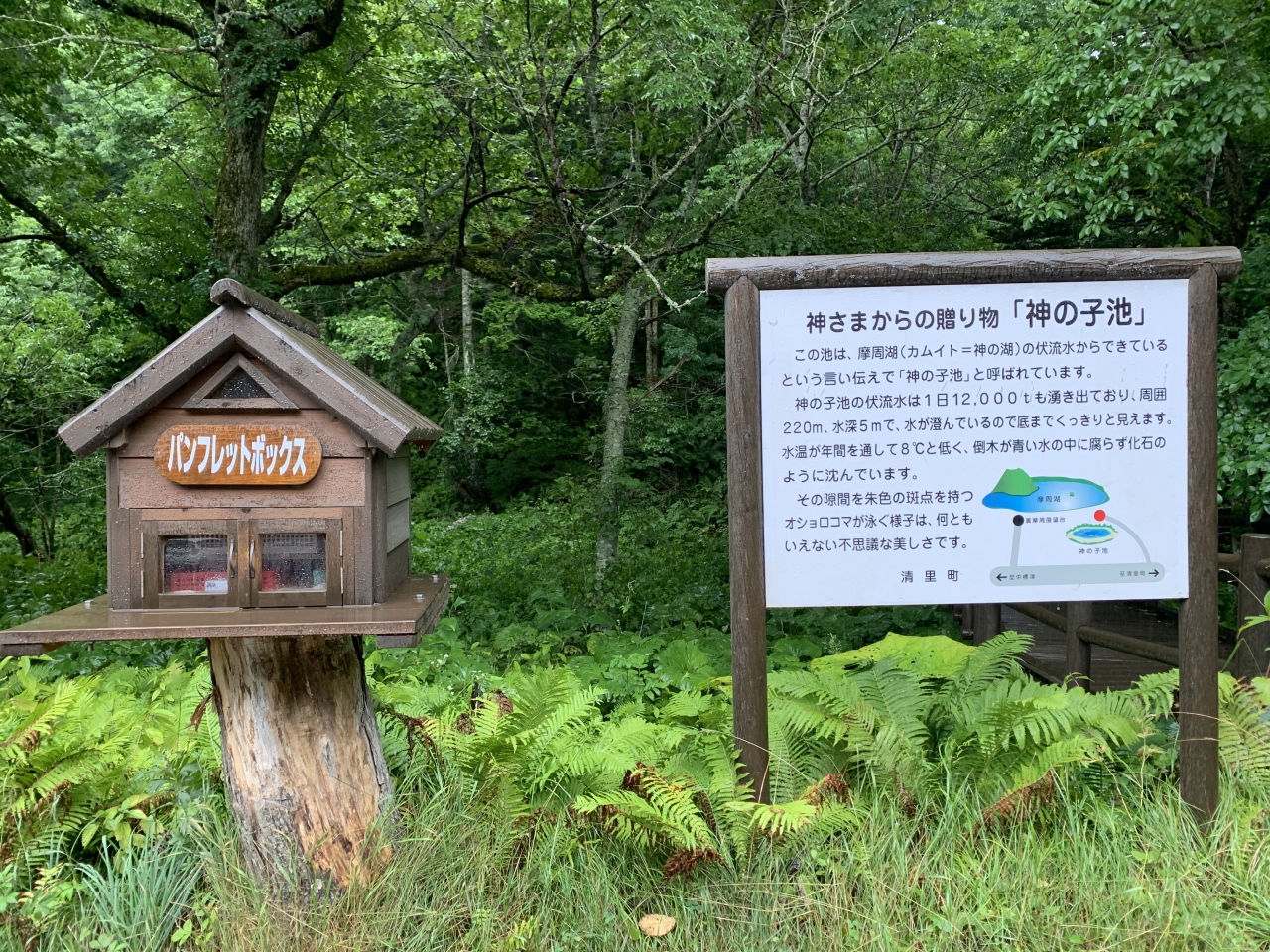 川湯温泉から北上して清里町に入り、「神の子池」に立ち寄りました。細い砂利道を通って駐車場へ向かいますが、砂利道では脱輪している車がいましたので要注意です。駐車場からは遊歩道ですぐ。天気が雨だったため青さ全開とはいきませんが、それでもかなり青かったです。アイヌ語でカムイトー(神の湖)を意味する摩周湖、その地下水による青い水をたたえるとされている池です。なので「神の子池」と呼ばれるのだとか。伏流水は1日に1万2千トンも湧き出すそうで、画像のように溢れ出してました。ひどくない雨ならあきらめずに訪れることをお勧めします。
