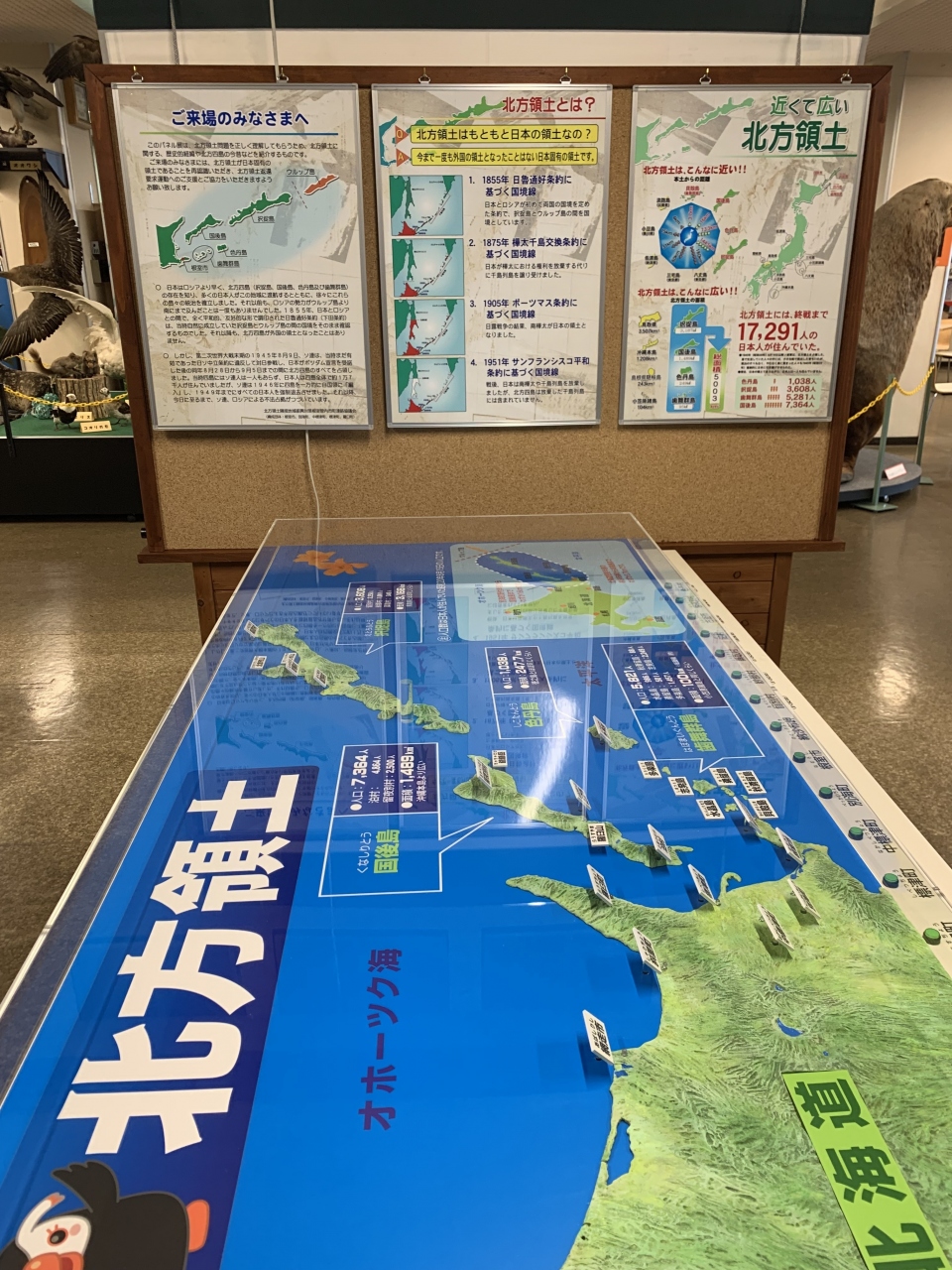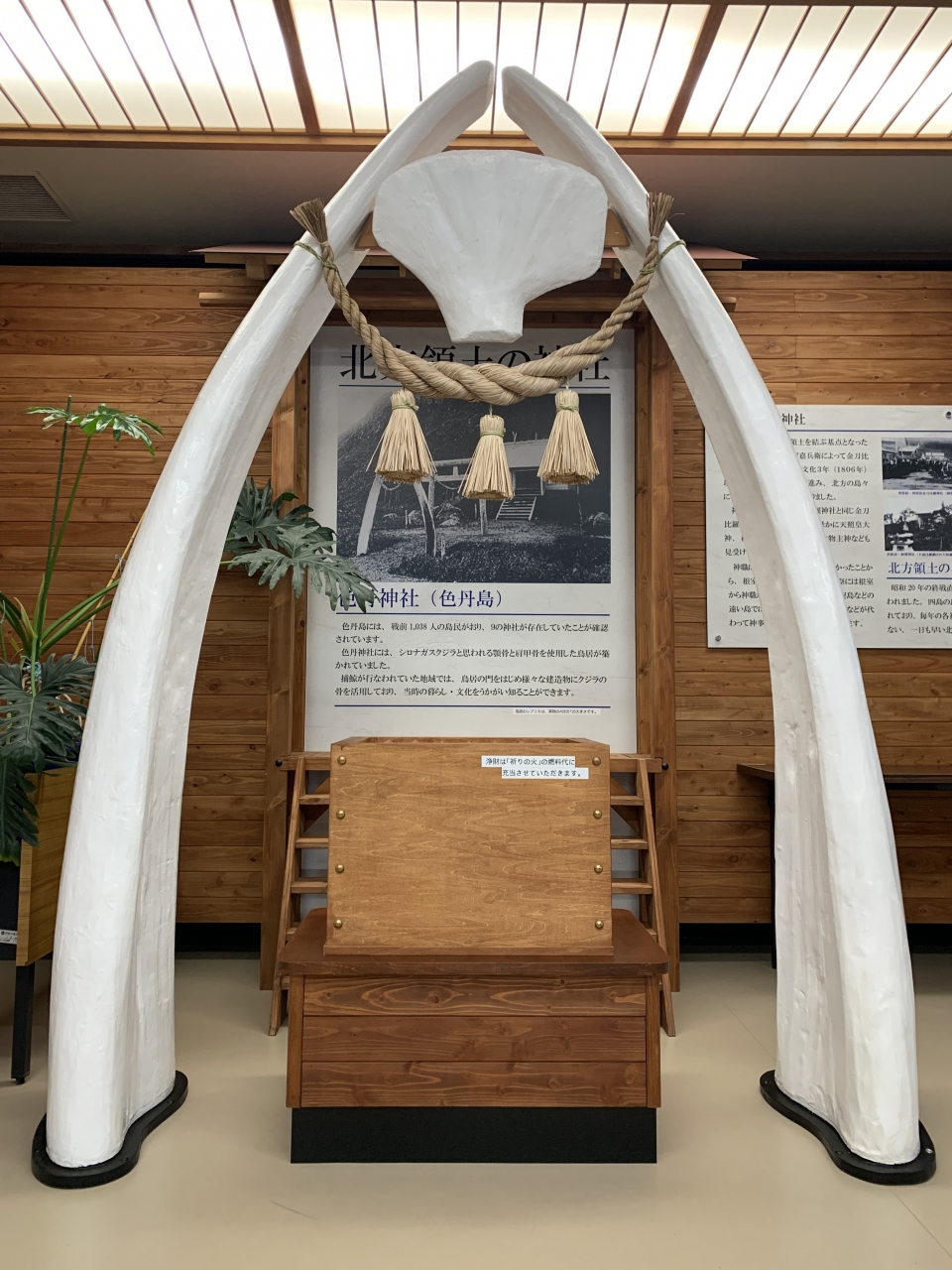 望郷の岬公園で色んなモニュメントを一通り見た後は「根室市北方領土資料館」へ。一風変わった色丹神社の鳥居は、シロナガスクジラの骨ということで驚き。根室まで来たからには北方領土問題に触れない訳には行きません。戦前の北方四島…住民だった日本人の暮らしぶりを写真で紹介。戦前の昭和11年(1936年)に国後島で撮影された映画「生命の冠」、缶詰工場の経営の苦難を題材にした作品の様です。この中のドキュメント映像が当時の現地の様子を遺す貴重なものなのでしょう。終戦直後の昭和21年(1946年)の北方領土の写真。日本人とロシア人が混住していた”空白の時代”。そんな北方領土の貴重な資料が豊富に展示されていました。