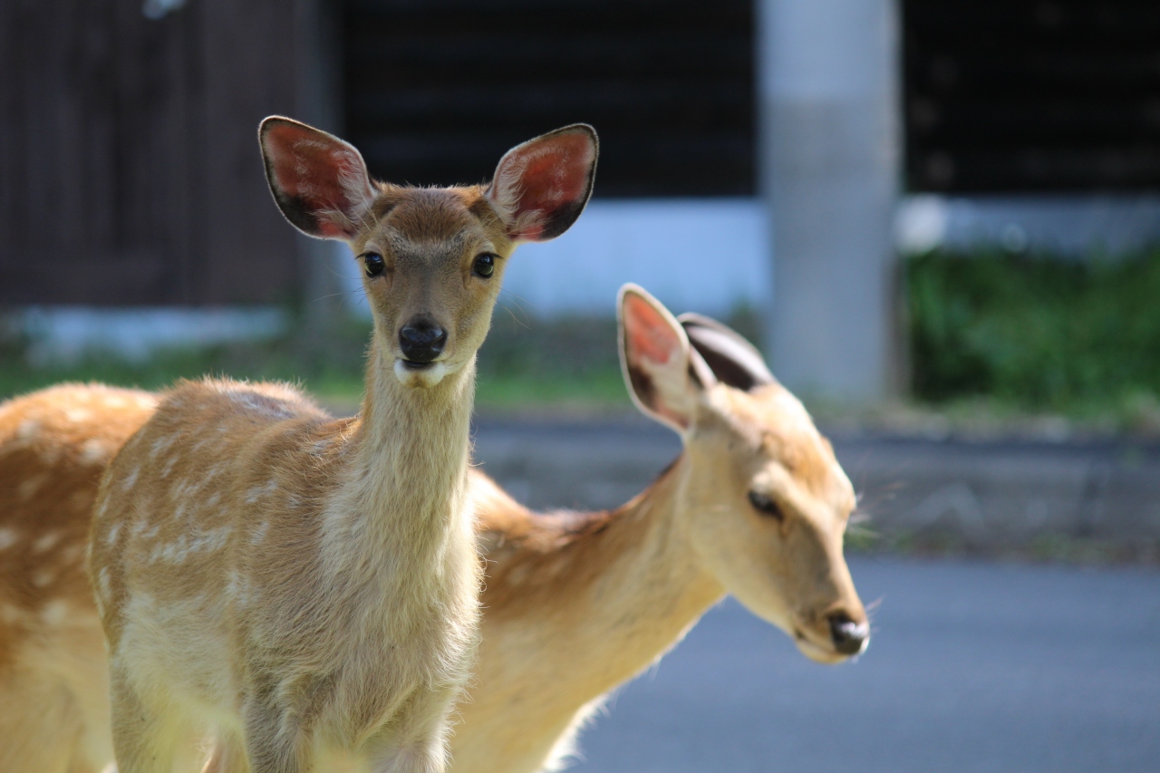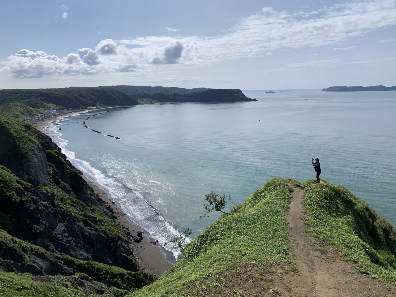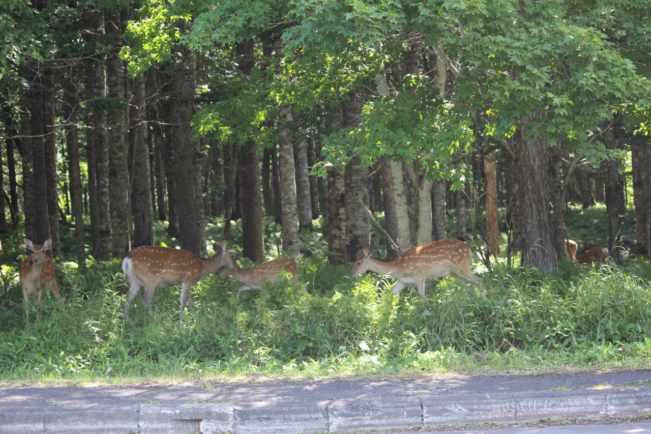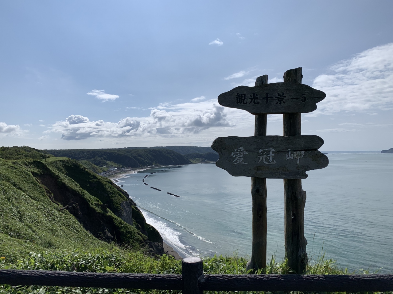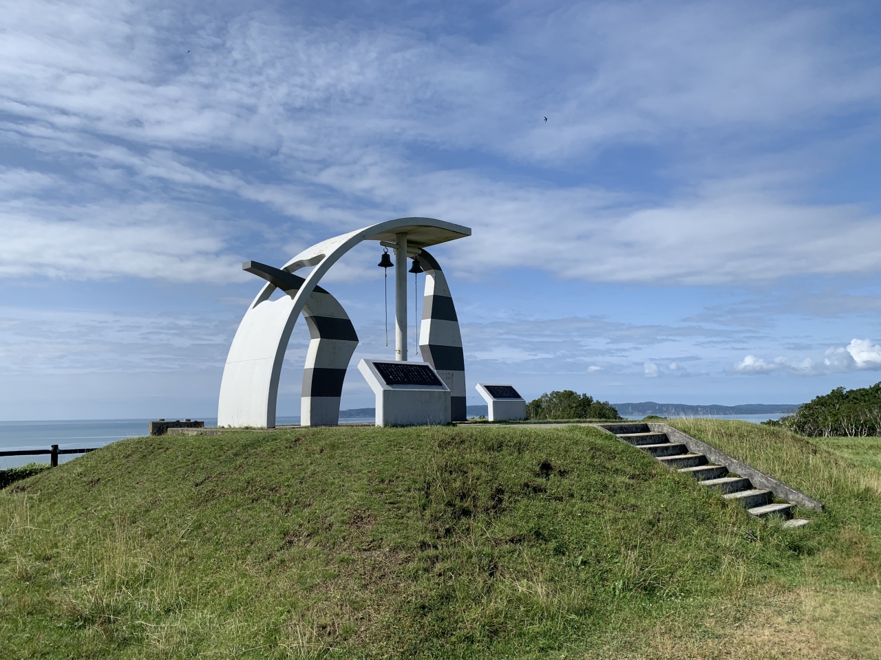 愛冠岬公園の専用駐車場(無料)からは徒歩で向かいます。途上にはアイカップ自然史博物館がありましたが、訪れた日は開館していませんでした。アイヌ語でアイ・カップ(矢の上のもの)は、矢の届かないところから”できない、届かない”という意味を持っているそうです。平成4年(1992年)に設置されたモニュメント”愛の鐘ベルアーチ”。アイカップという名前から”愛とロマンの岬”と長年PRしたことでカップルに人気の岬になってるようです。岬の突端からは、海鳥繁殖地として知られる「大黒島」と「小島」が見えます。愛とロマンも良いですが、単純に景観が素晴らしい岬なので一見の価値ありです。駐車場に戻ったらエゾシカの群れがいました。