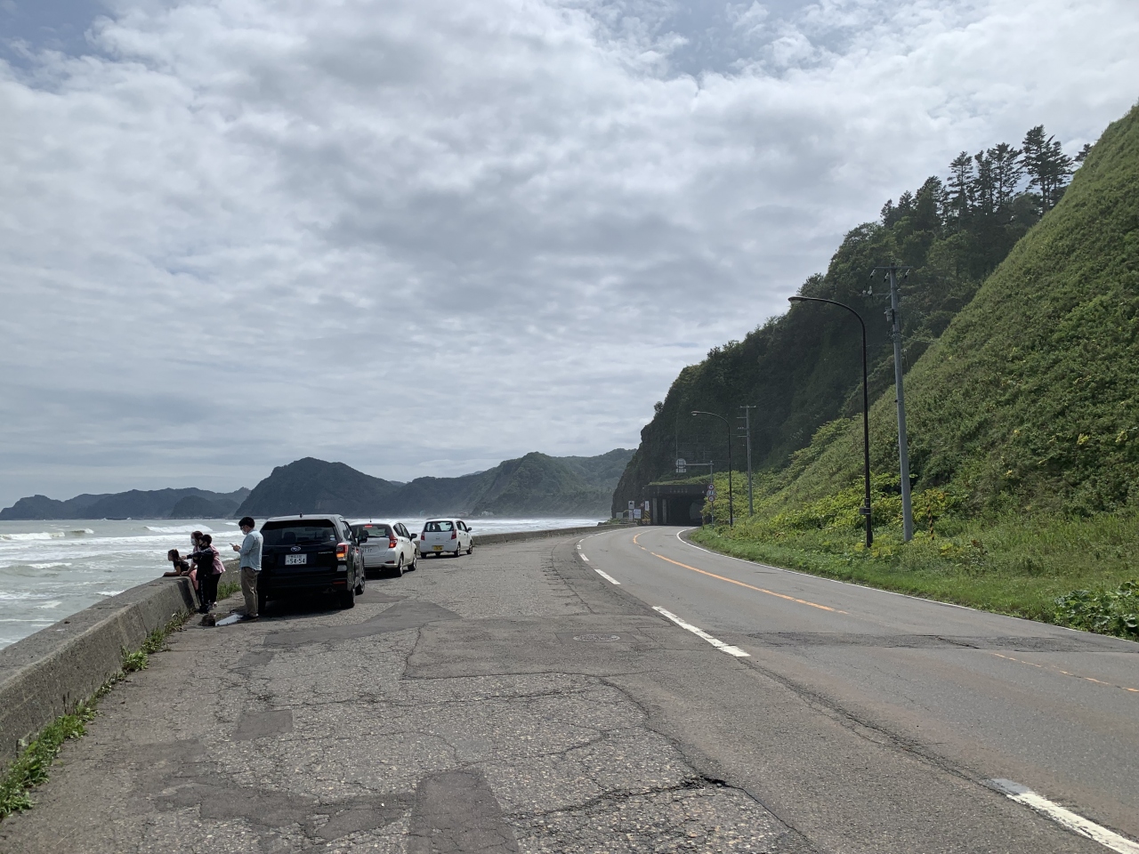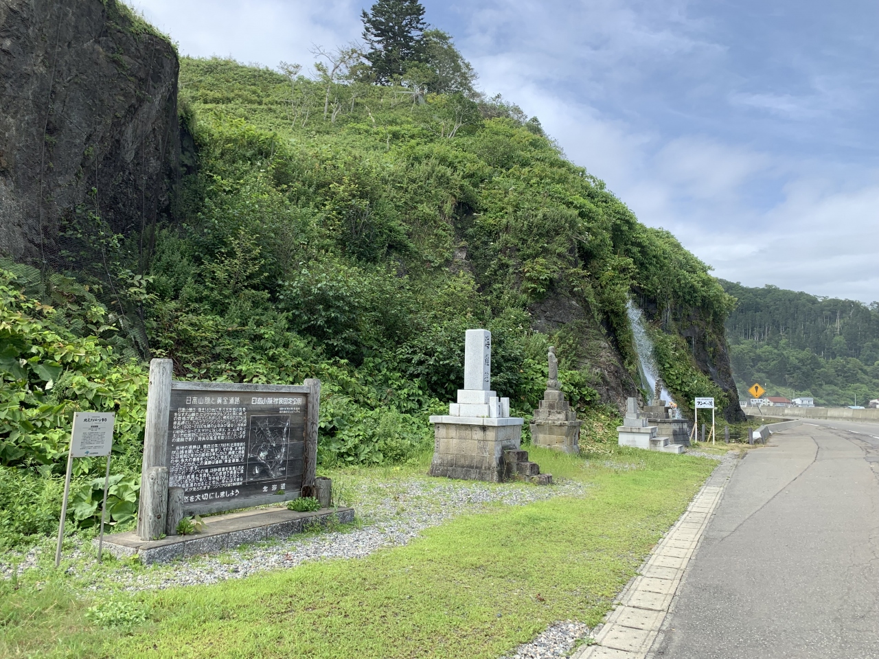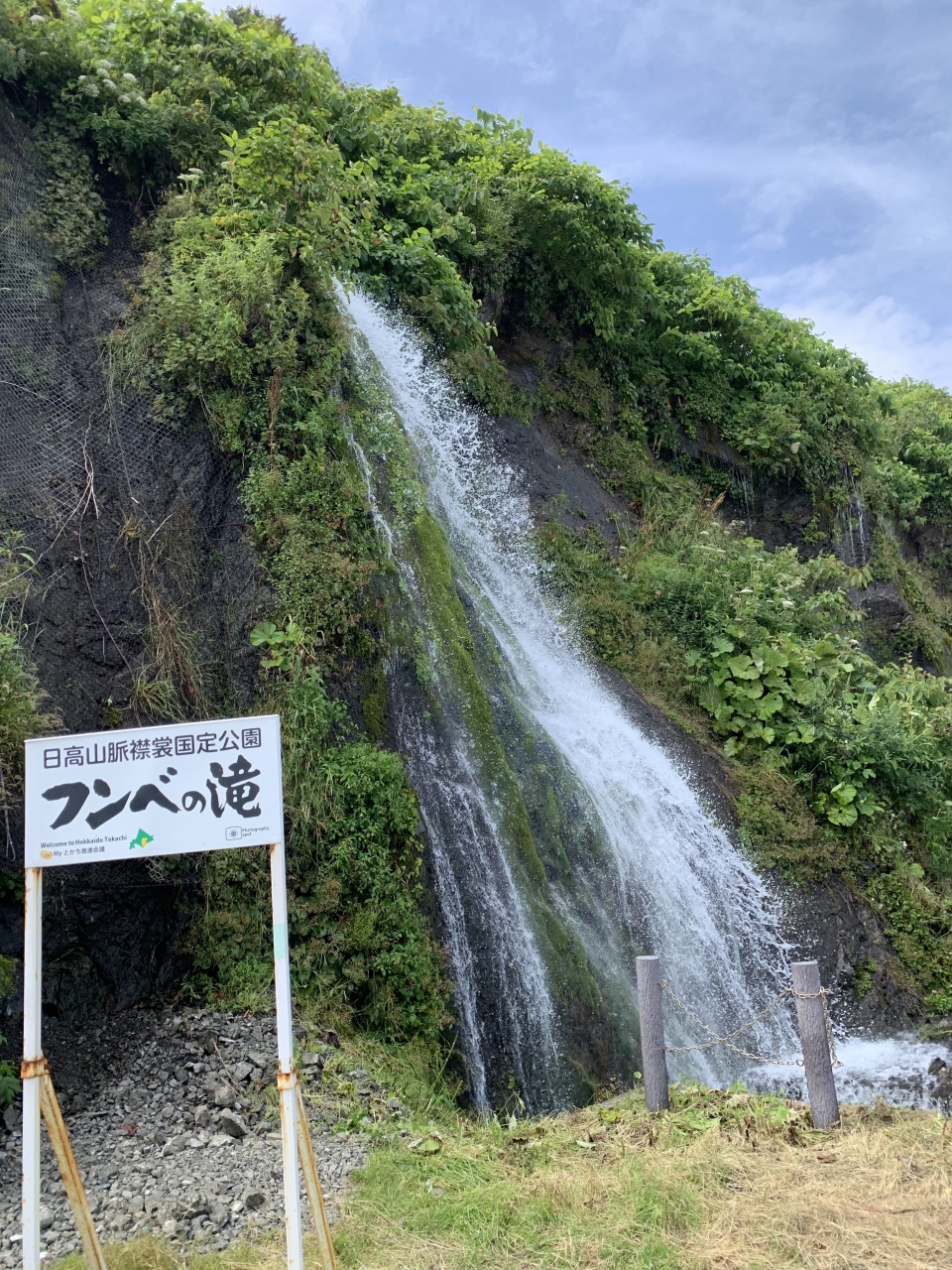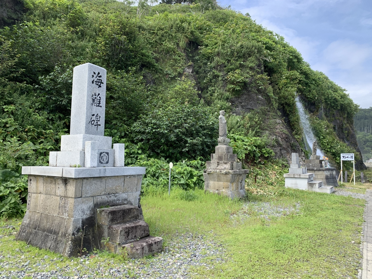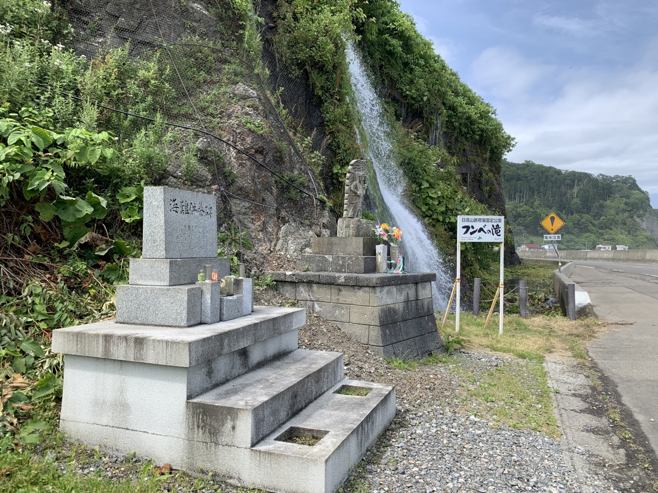広尾町に入って「フンベの滝」に立ち寄り。路側帯にパーキングエリアがあります。フンベの滝は砂礫層からの湧水で、”フンベ”とはアイヌ語で鯨なのだそうです。この辺りは鯨が打ち上げられることがあったのでそう呼ばれるようになったとか。傍には不動尊像と海難供養碑が建っていました。小さいけれど水量豊かな(一年中絶えないらしい)涼しげな滝でした。