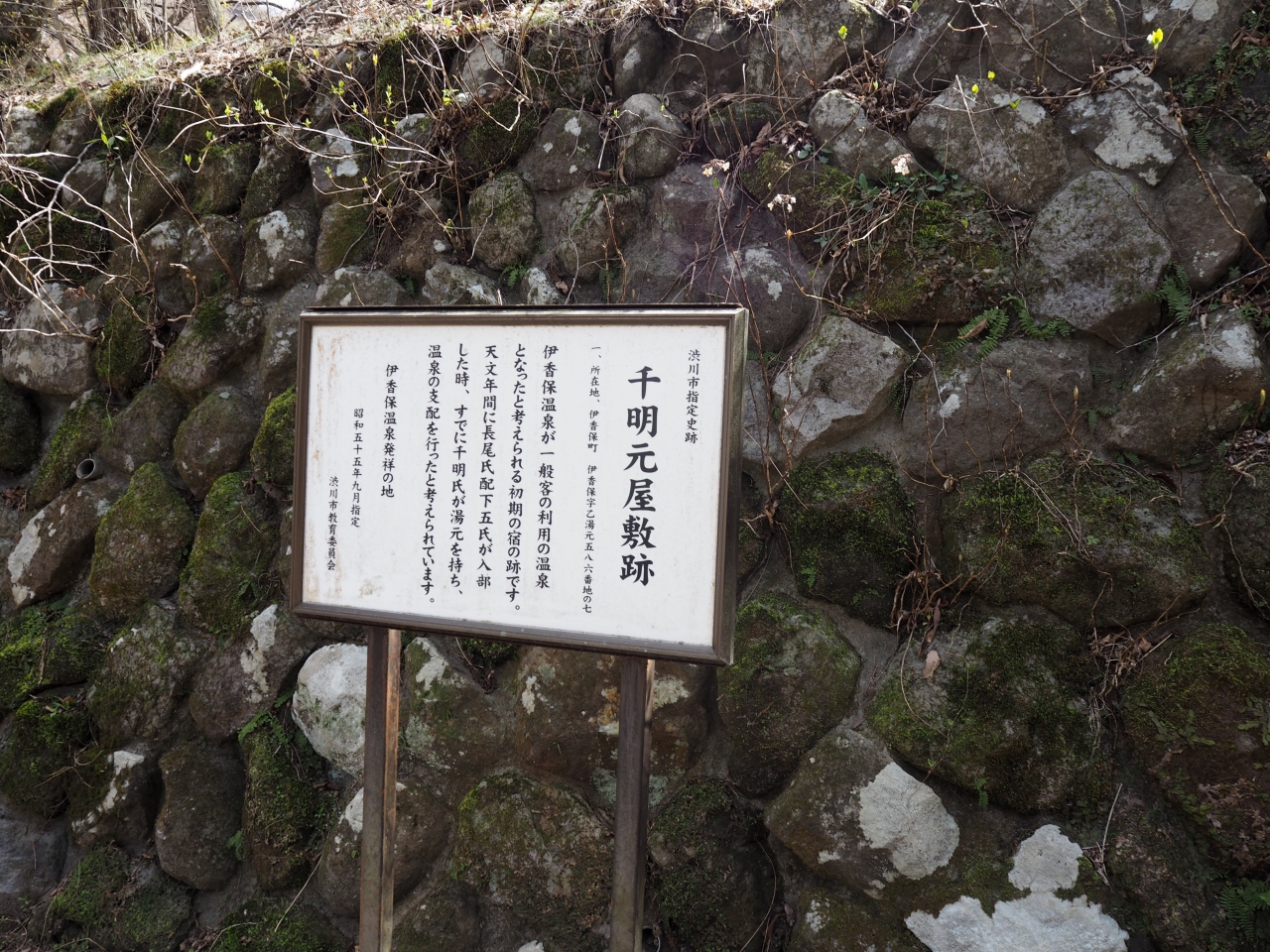 伊香保神社から山道を登ってきて河鹿橋を渡り100メートルほど下ると、石垣の盛り上がった場所があり、ここが千明元屋敷跡です。伊香保温泉が最初に利用され始めたときの宿泊所の屋敷跡です。現在は盛り上がった石垣があるのみです。近くに説明板があるので、それを読むと来歴がわかります。現在でも人もほとんど歩いていない山奥なので、当時の人も来るのが大変だと思われます。