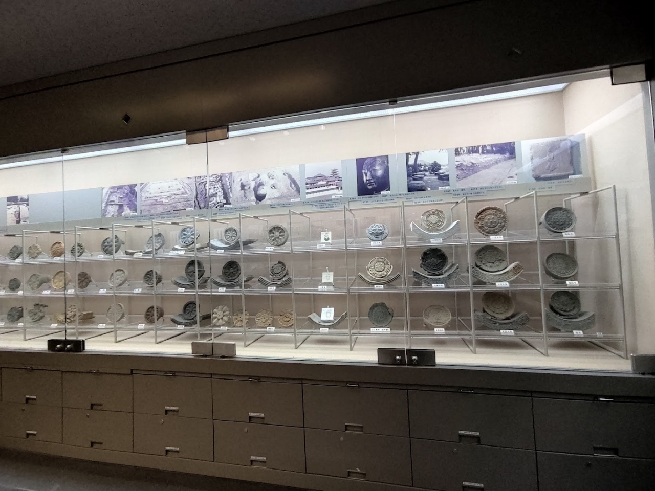 藤原京跡周辺にはいろいろと文化財展示館や展示室が多いですが、こちらは奈良文化財研究所付属の資料館でした。こちらでも昔の瓦をはじめ多くの展示品があり、藤原京跡の詳細図などもあって歴史が理解しやすかったです。