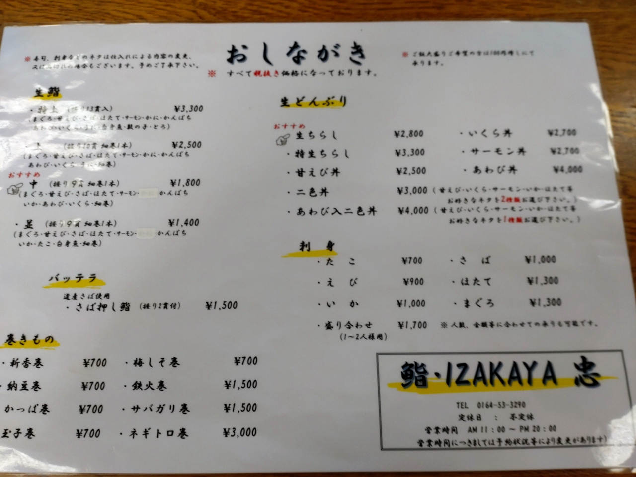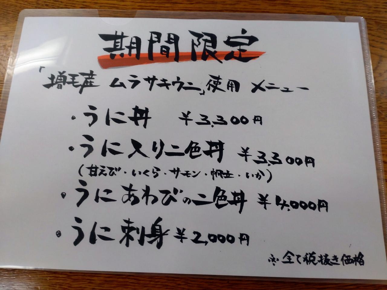 ウニ丼を食べるつもりが、メニューを見てランチの特上海鮮丼¥3300【税抜き】にしました。マグロ・甘えび・ホタテ・サバ・イカ・かに・かんぱち・アワビ・いくら・うに・とろ・数の子・北寄貝と盛りだくさんの具で美味しかったです。期間限定うに丼も¥3300(税抜き)でした。支払いは現金のみ。