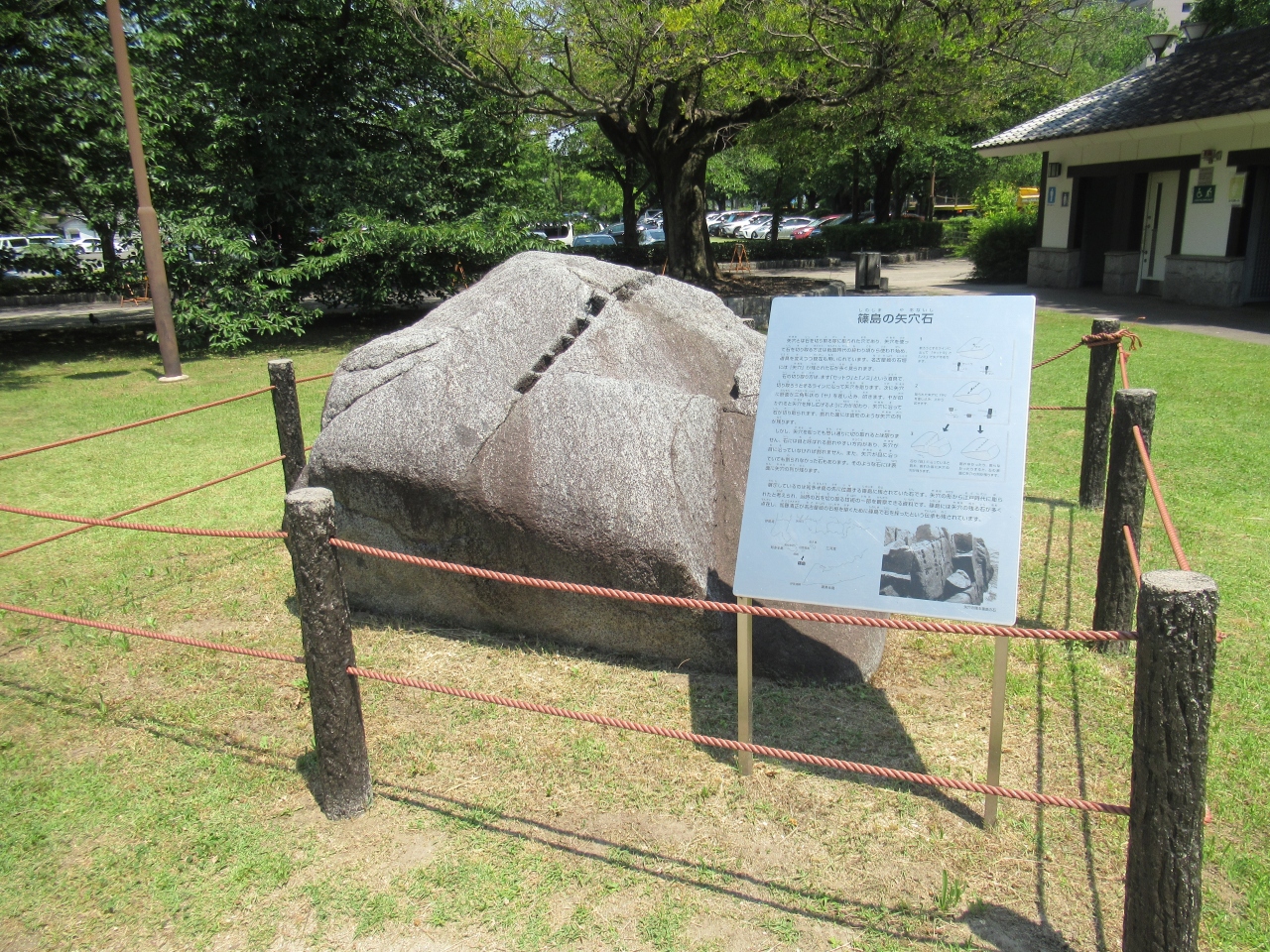 名古屋能楽堂近くの草地に建つ加藤清正像のそばに置かれています。矢穴とは大きな石を切り取るために彫られた穴のことで、ノミとセットウで矢穴を彫り、ヤという道具を差し込み叩き割る方法で、現在も用いられているとのことです。展示されている石は知多半島の篠島で見つかった矢穴が残る石です。現代用いられている石割の方法が、400年前にも用いられていたことに驚きました。