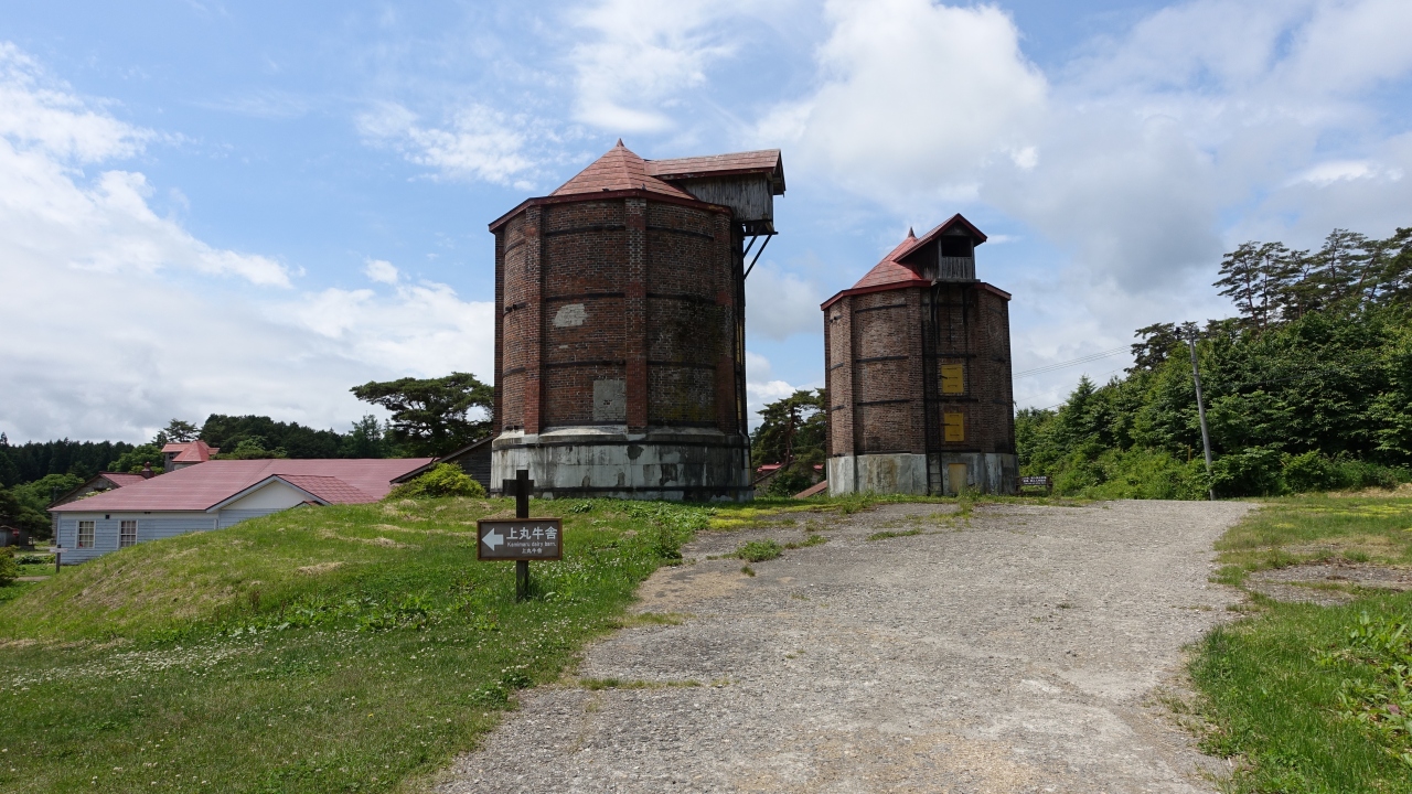 上丸牛舎の敷地内にある2つの堂々としたレンガ造りのサイロ。明治末期に建てられた日本最古のサイロで赤いとんがり屋根が印象的。現在は基礎の部分をコンクリートで補強しているが、建設当時は基礎部分もレンガだったという。周りに建つ牛舎群と併せてインスタ映えするスポットである。