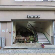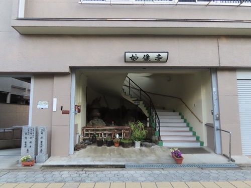 谷町7丁目交差点と谷町8丁目交差点の中間あたり。谷町筋に東面している日蓮宗の寺院です。南隣は本長寺、北隣は妙經寺でいずれも同じ日蓮宗です。門がないばかりか、建物中央に2階へ続く階段があったため、最初寺院と気づかずに通り過ぎてしまいました。よくよく見ると「文楽 人間国宝 四世・野澤錦糸(墓所)」とありました。野澤錦糸は文楽義太夫節三味線方の名跡だそうです。同じく八世・野沢吉兵衛ともあり、同じく三味線奏者の名跡で大正~昭和初期の人物でした。コンクリート造りの建物が大通りの喧噪から墓地を守っている、そんなイメージがわきました。
