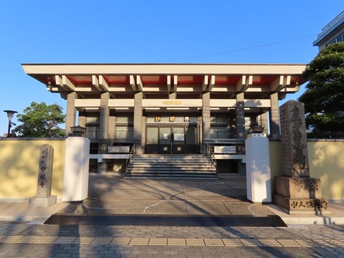谷町筋に東面している日蓮宗の寺院です。谷町7丁目交差点から南下した方が若干近いかもしれません。大阪メトロの最寄り駅で考えると「谷町六丁目」と「谷町九丁目」のほぼ中間あたりですね。谷町筋の西側を大仙寺、願生寺、本政寺、本長寺、妙像寺と南から見ていきましたが、こちら妙經寺が鉄筋コンクリート造りながらもゆとりがあっていちばんお寺らしいです。ただこれは境内の広さとの兼ね合いだけかもしれません。堂々としていますがそのいっぽうで無機質な雰囲気も否定できませんでした。