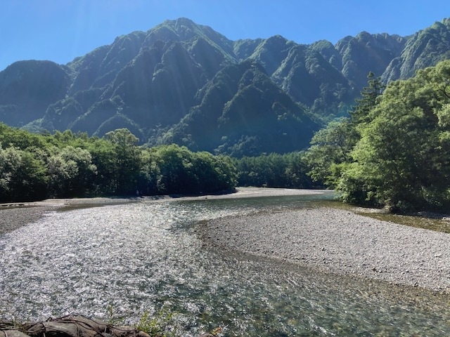 梓川は上高地の中心を流れる川です。とても冷たく、川に足だけをつけて、入るとすぐに我慢できなくなる冷たさです。透明で、青い色で、とてもきれいです。是非一度上高地に行き、その冷たさを体験してみてぐたさい。