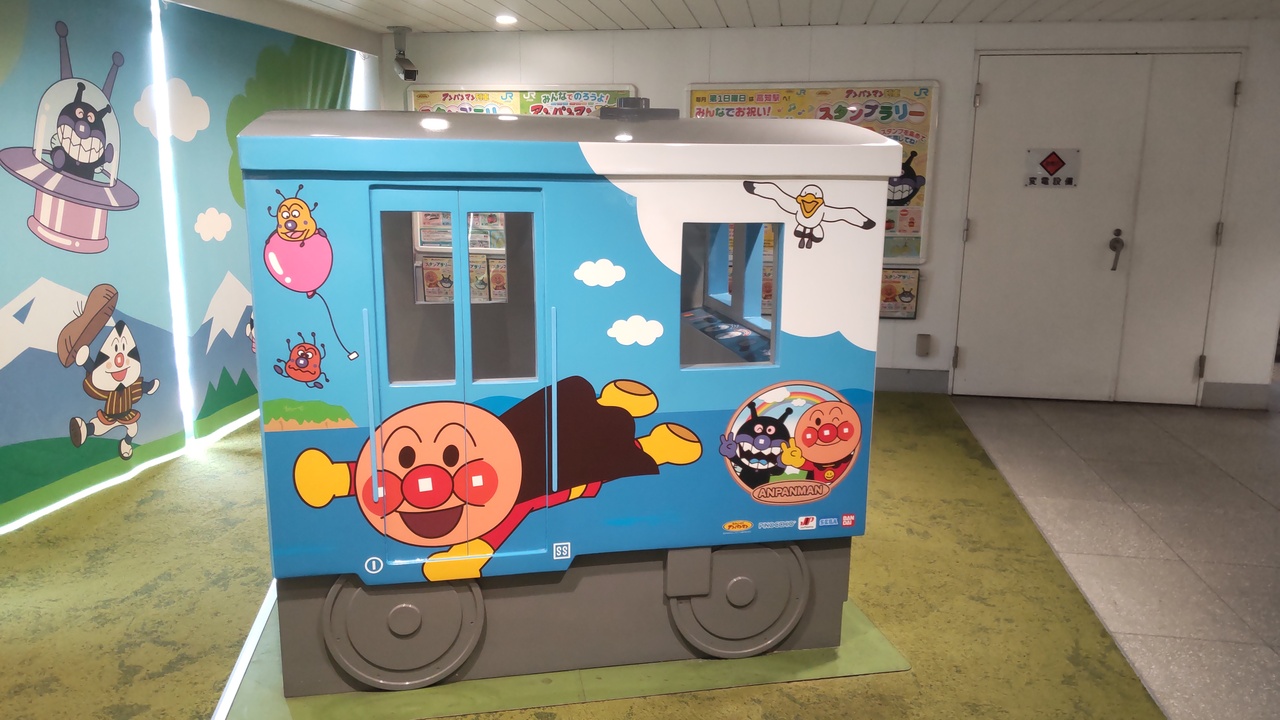 高知駅の中にはアンパンマンの電車などが飾られていて、2歳児の子どもは大喜びでした。実際にアンパンマン列車の中に入って写真をとることができます。近くには、アンパンマン列車のガチャガチャがあるのですが、両替が構内にはなく、外に出る必要があるので不便でした。