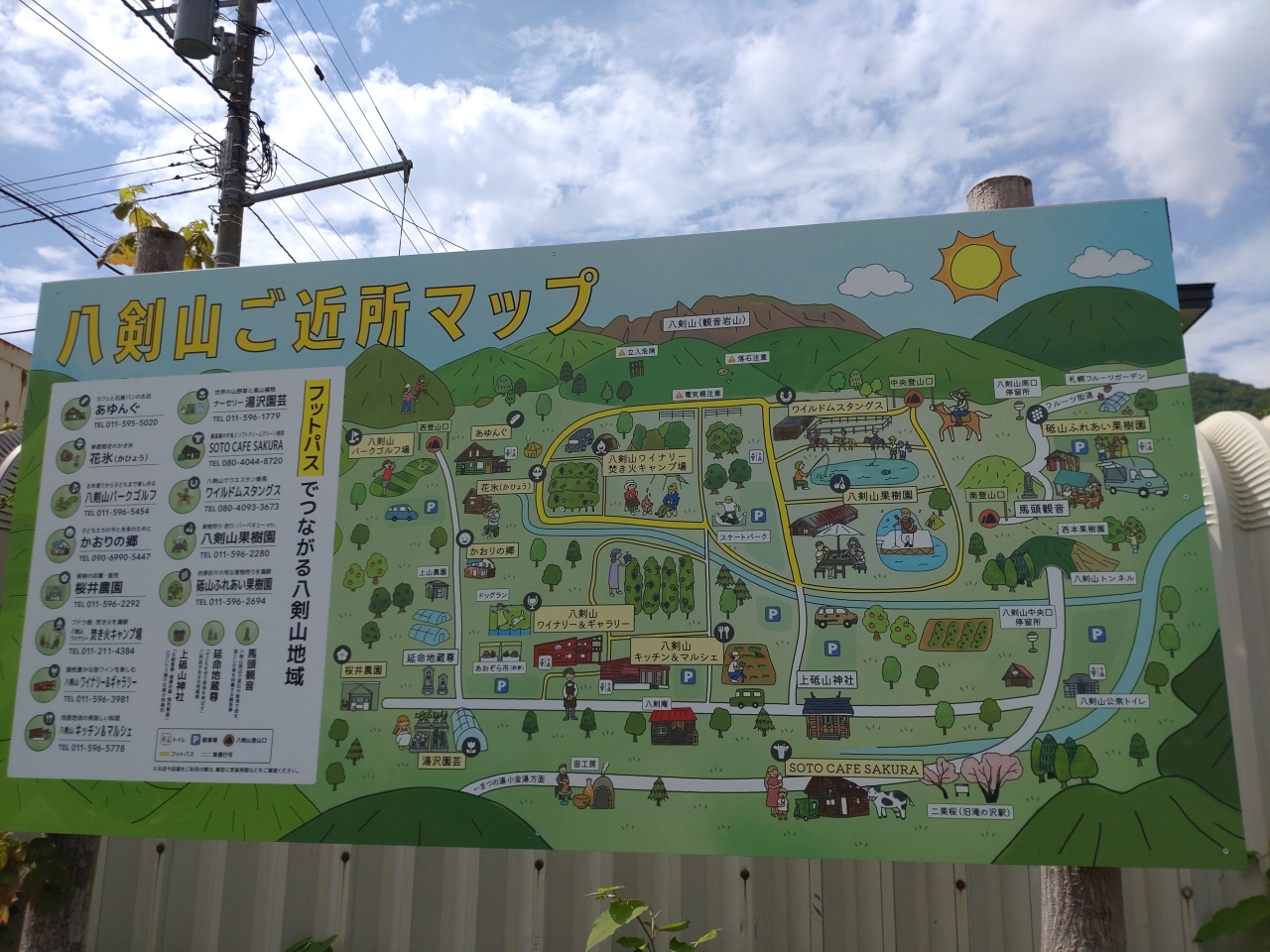 定山渓から札幌方面に向かう時、頂上部分が岩になってる山が見えました。周辺にキャンプ場やレストラン、ワイナリーもあるとのこと、どこかでひと休み出来ればと行ってみました。キッチン&マルシェの傍にご近所マップがあり、登山だけじゃなく色々楽しめる場所と知りました。